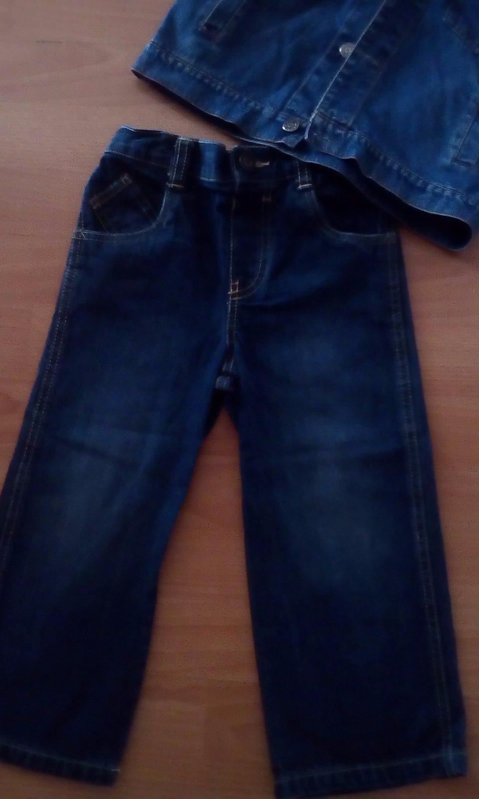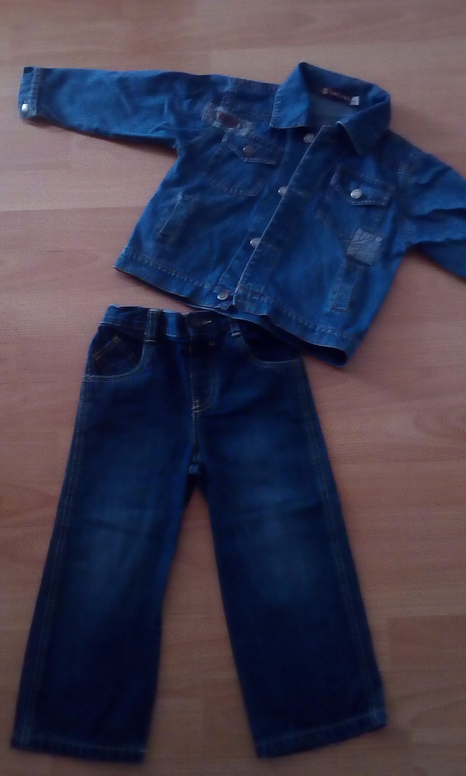 Obydve veci malo nosene,drobec rychlo vyrastol,rifle zn.Cherokke dl. 57cm,na pase je nastavitelna guma,riflovka zn.youjoy dl.38cm,sirka 36cm,dl.rukavu od krku 41cm,cena spolu 5,50€+post.