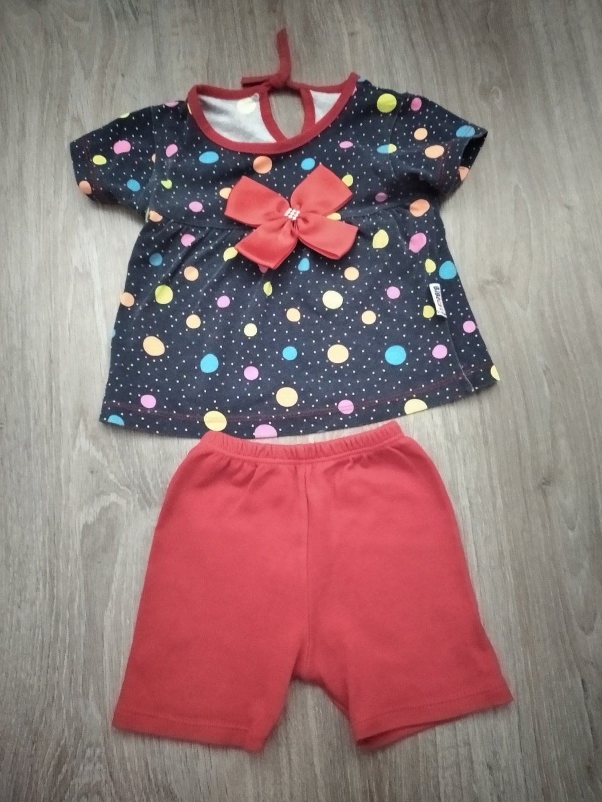 Súpravka je v dobrom nosenom stave, kvalitný bavlnený materiál, veľkosť uvedená 6-9 mes., tričko šírka 25 cm, dĺžka 26 cm, kraťasky v páse 21 cm, natiahne sa na 29 cm, dĺžka 21 cm.