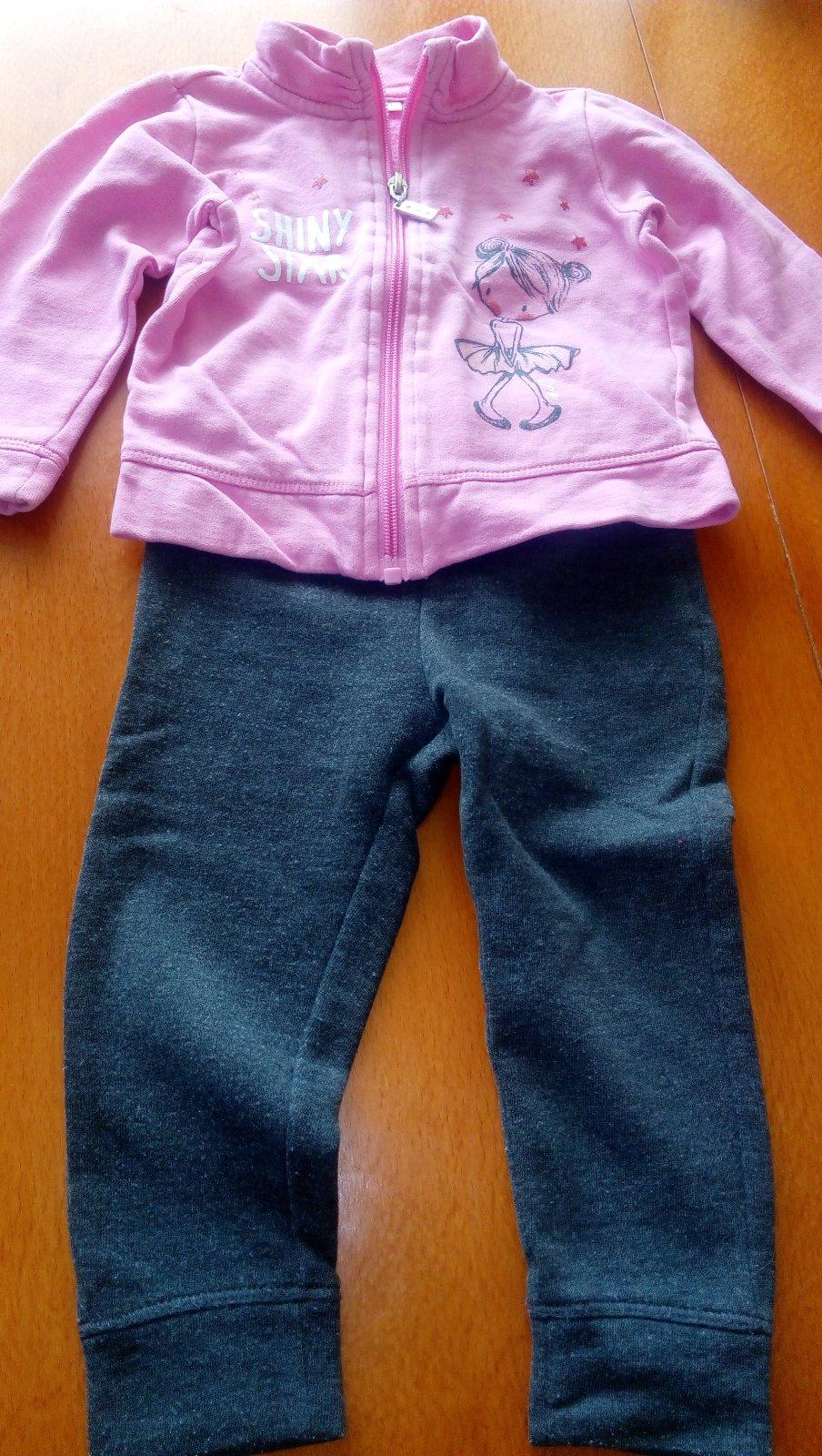 Ponúkam mikinku ruzovu na zips so stojacikom a krasnou aplikáciou. Tmavosede nohavice také leginy na gumu dole zakončenie na patent. Pekné to vyzerá oblečené Veľmi praktické. Na vek 1,5 - 2 roky.
