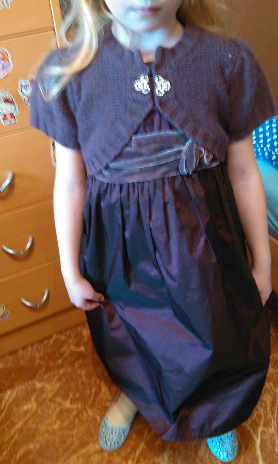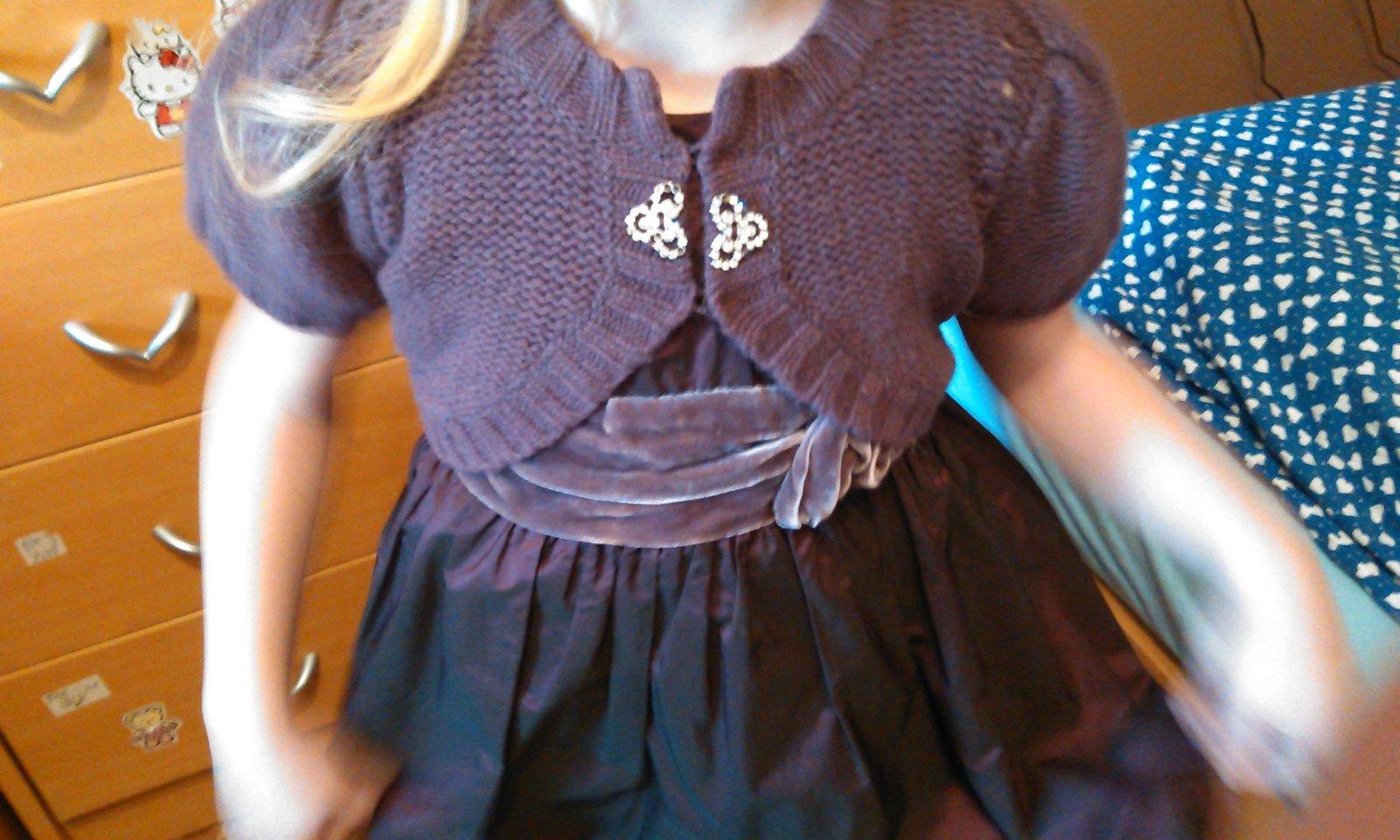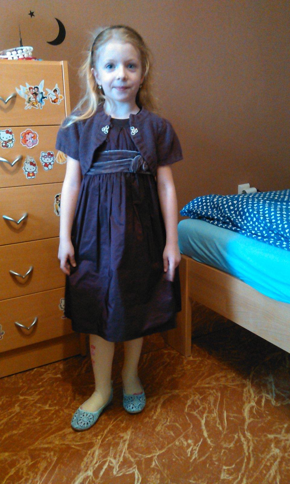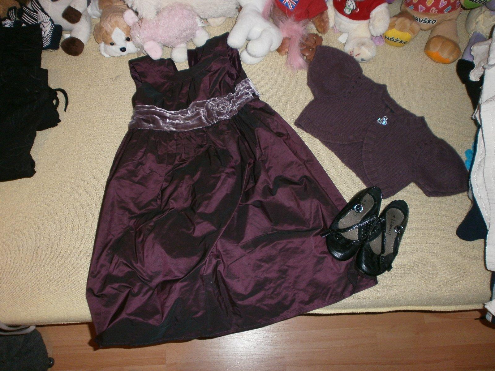 Fialové slávnostné šatočky s fialovým bolerkom s ozdobou na zapínanie. V zadu zips pre lepšie obliekanie a stuha na zaviazanie. Topánočky už žiaľ nie sú k dispozícii.