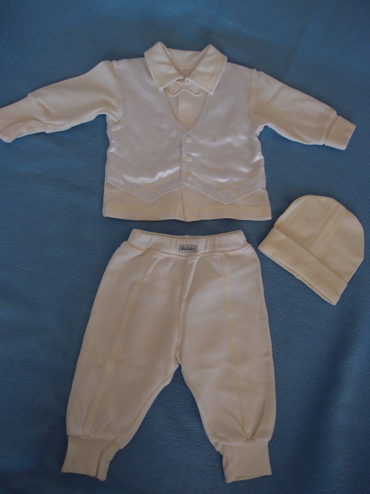 Predám súpravu na krst pre chlapca, použitú len 1x na krste. Je ako nová, bez poškodení.Farbu má jemne žltú s bielou prišitou vestičkou.