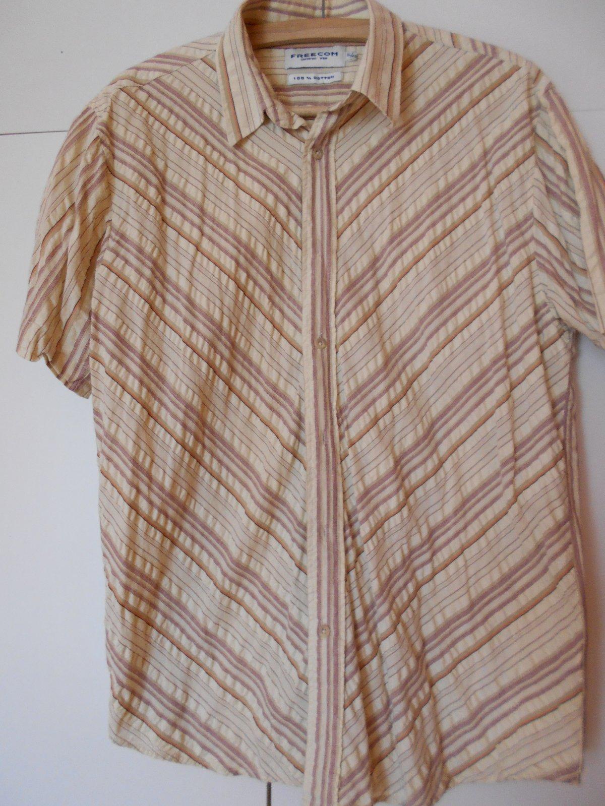 veľ. L Na krémovom podklade malé čierne vzory. Ruk. krátke, zapín. na gombíky, vpredu 1 vrecko. Bavlnená 100% košeľa. Stav – min. nosený 2x obl., veľmi dobre zachovalý. Miery viď. na obr. Ďakujem,...