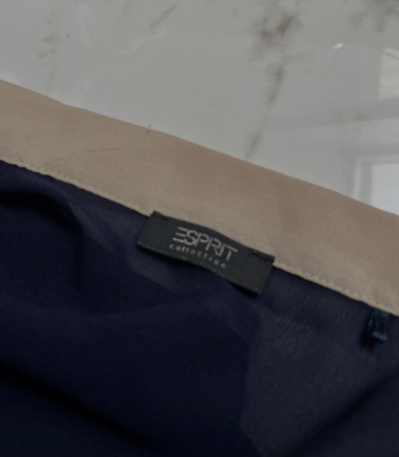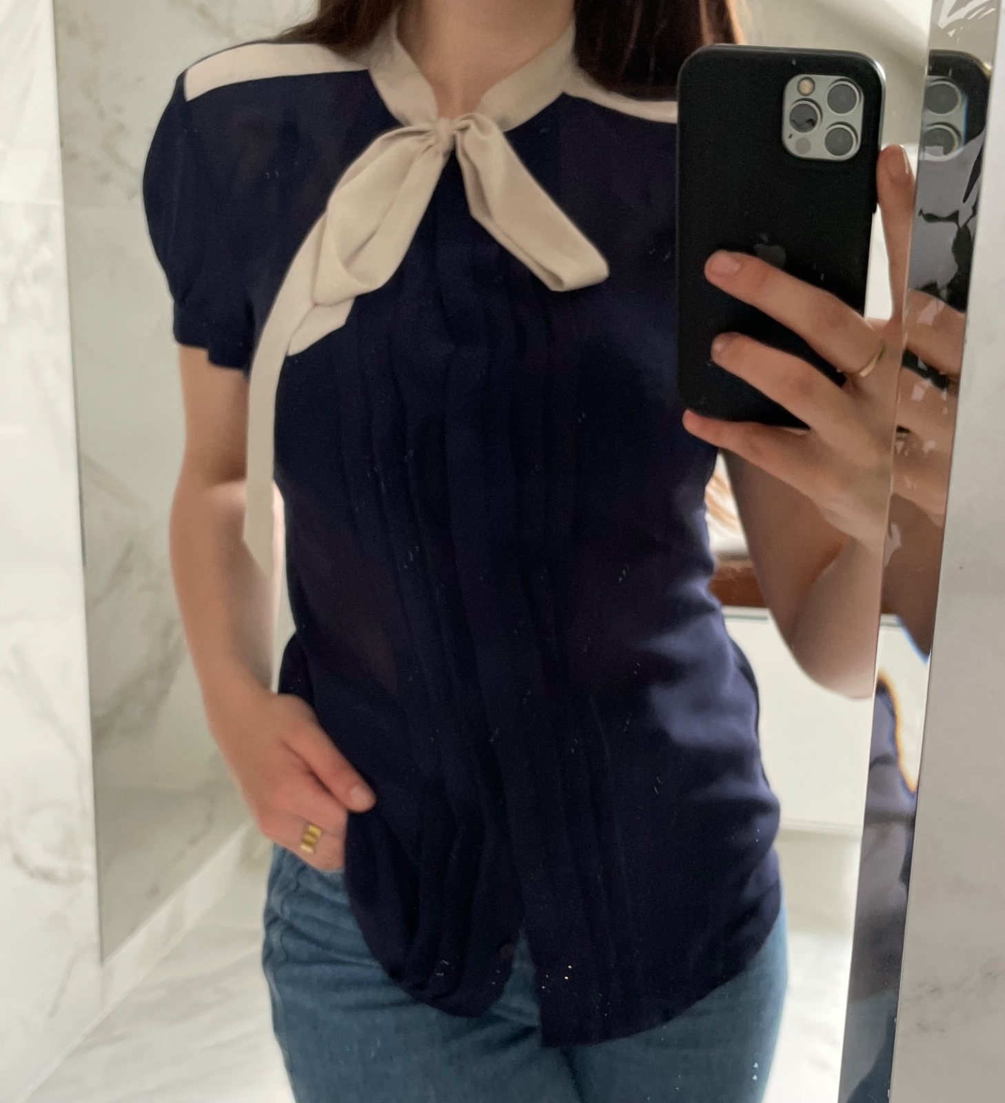 Krásna tmavomodrá blúzka s béžovými detailmi a mašľou okolo krku. Krátke rukávy, jemný šifónový materiál a elegantné záhyby vpredu. Výborný stav, oblečená len párkrát. Veľkosť zodpovedá S/M.