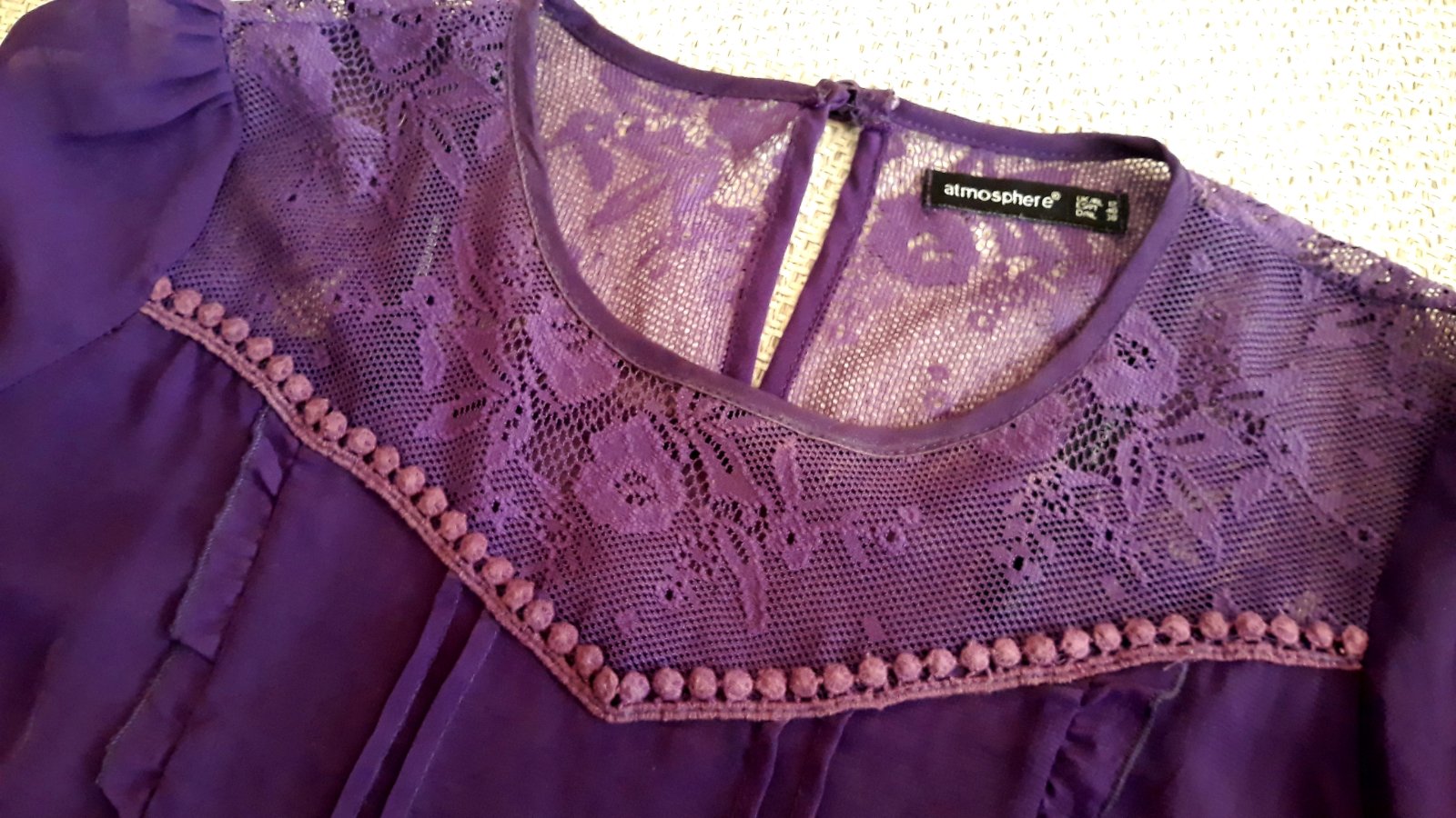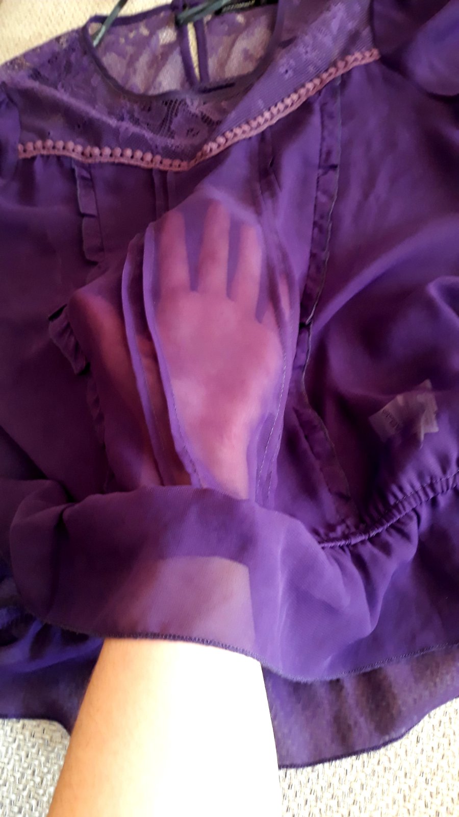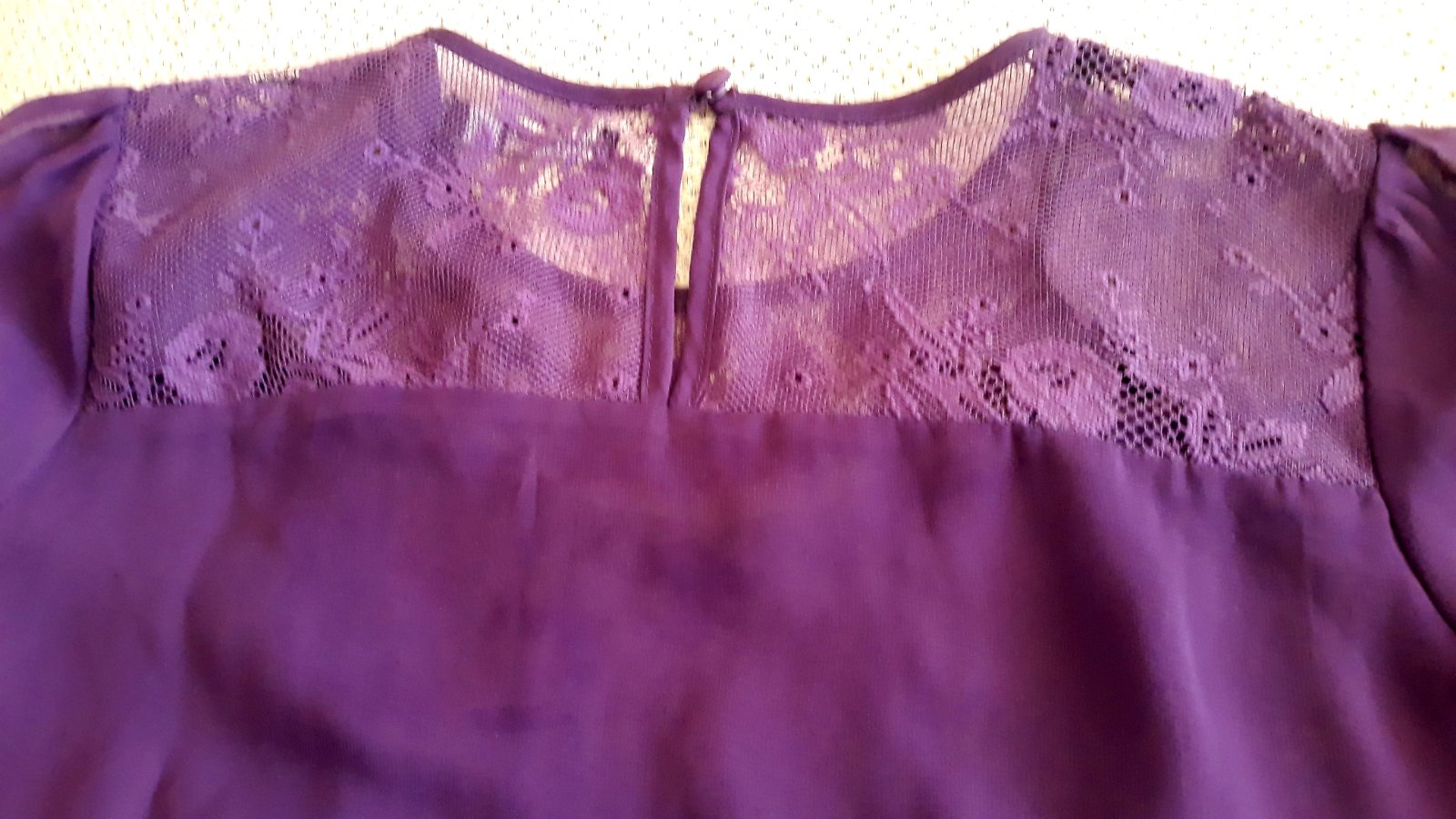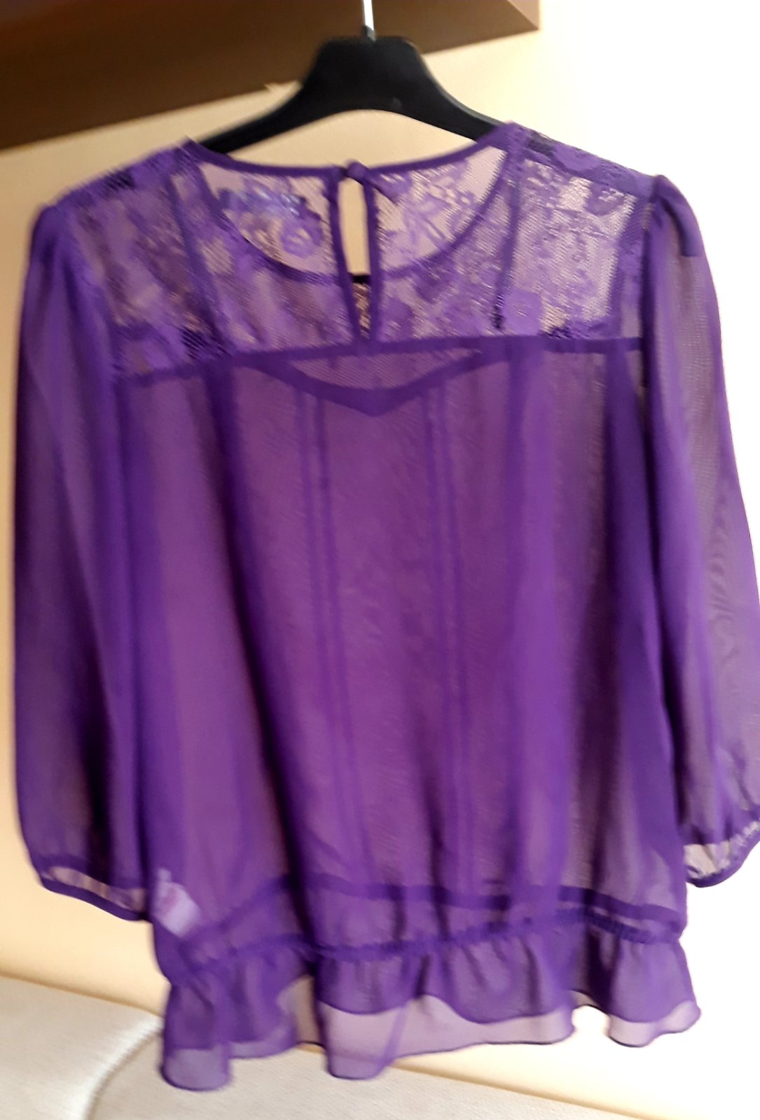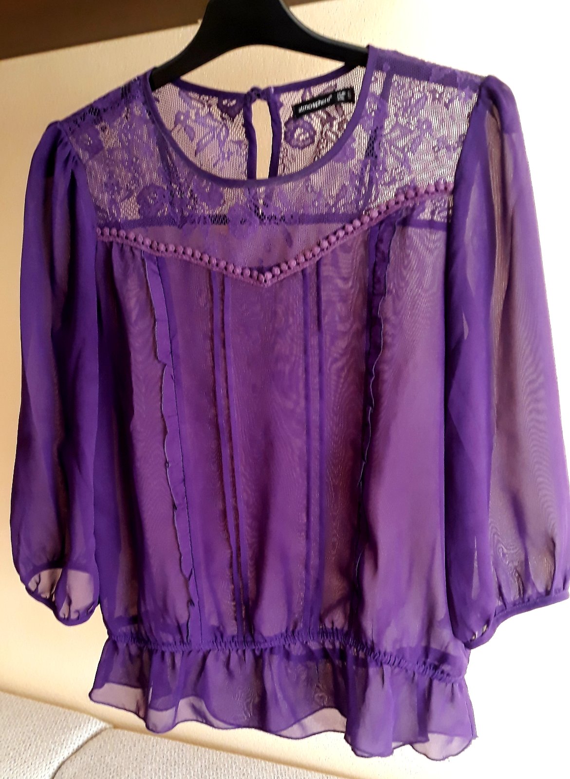 Krásna fialová blúzka v top stave. 100% polyester. Veľkosť 38-40. Obvod okolo pŕs 47cmx2, dĺžka rukávov 45 cm. V páse je riasiaca gumička.