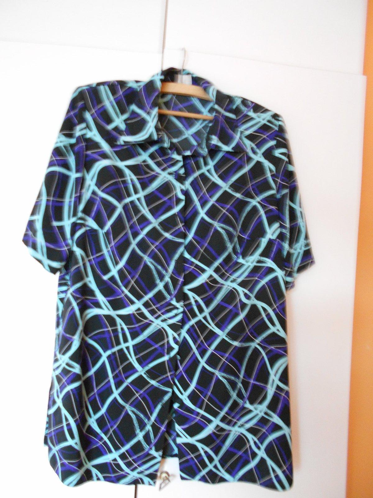 hodvábna blúzka s kratkym rukávom na bokov rozpárky zapínanie vpredu na gombíčky, troška dlhšia, voľný štýl. Podklad čierny na ktorom sú nepravidelné vlnovky-čiary,tyrkysovej a modrej farby. Nebola takmer nosená