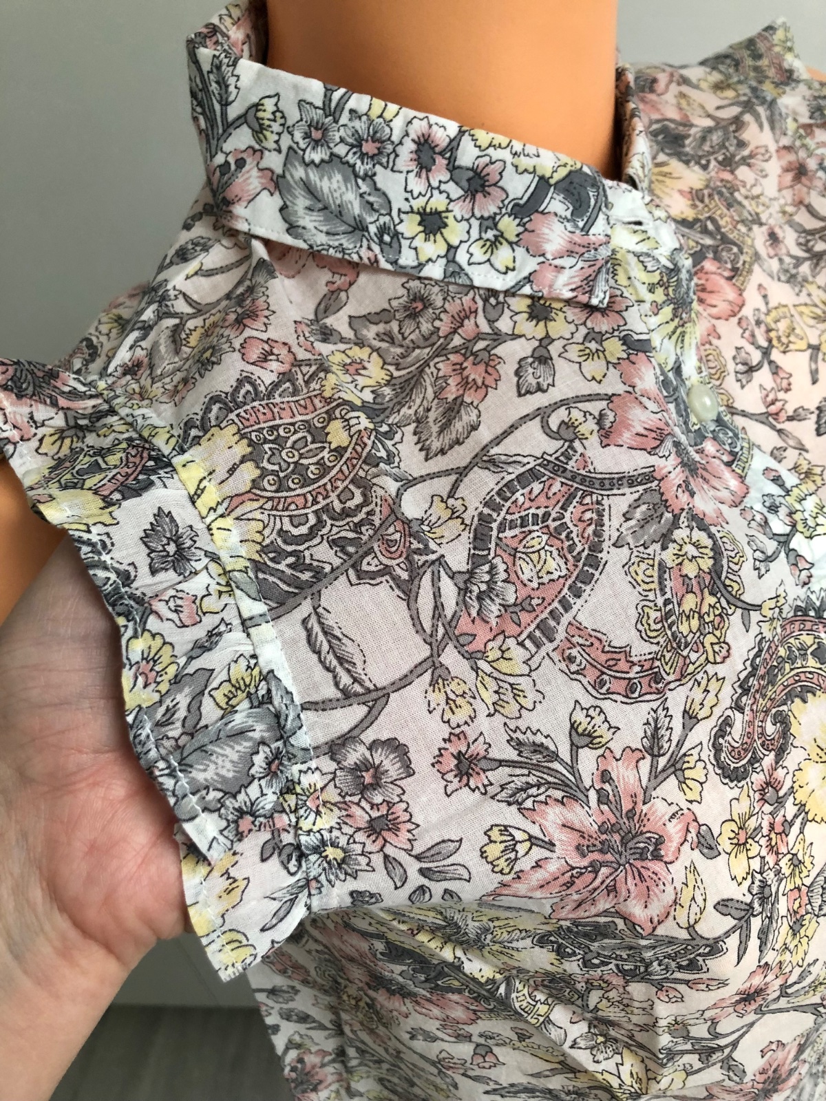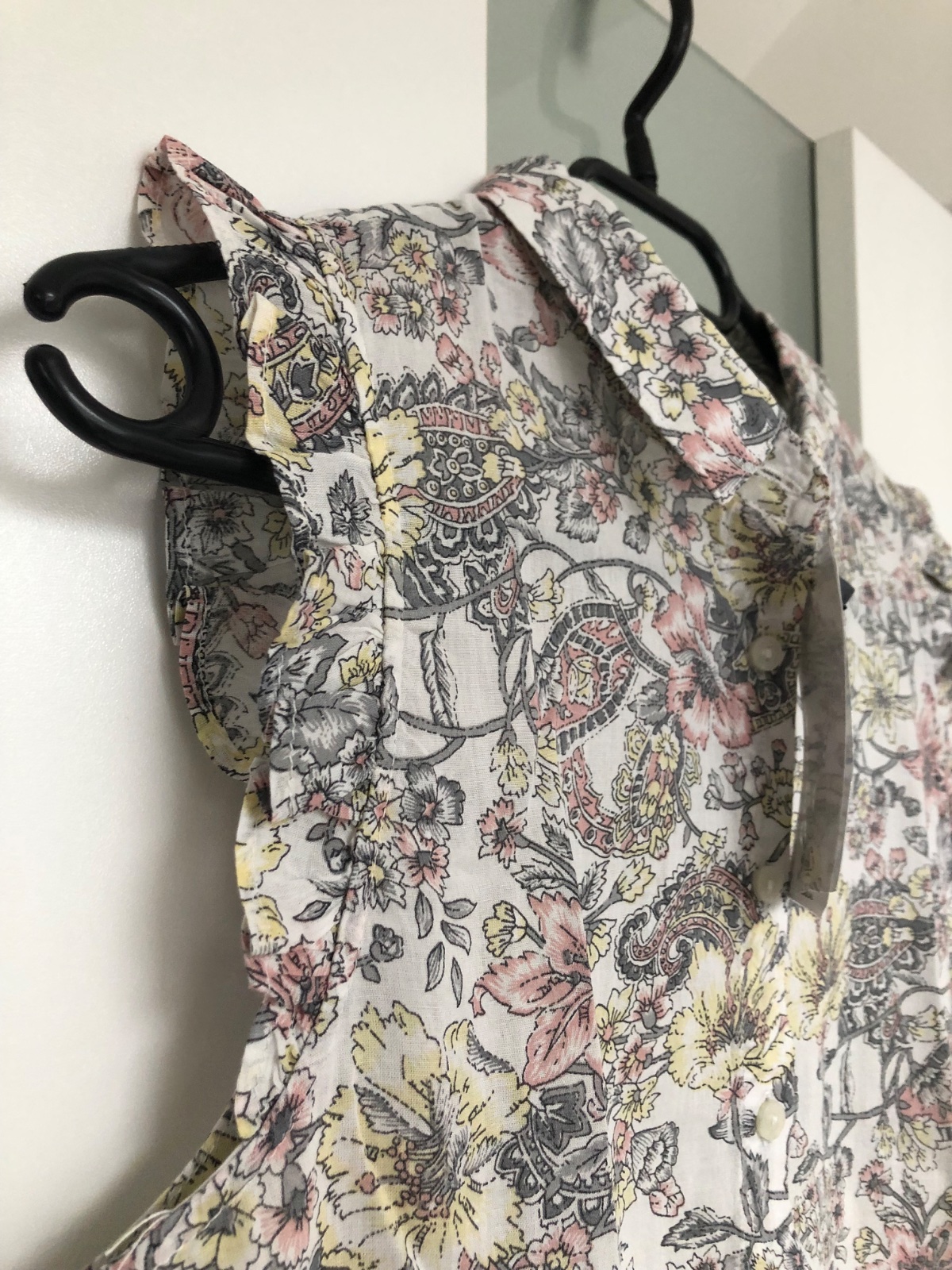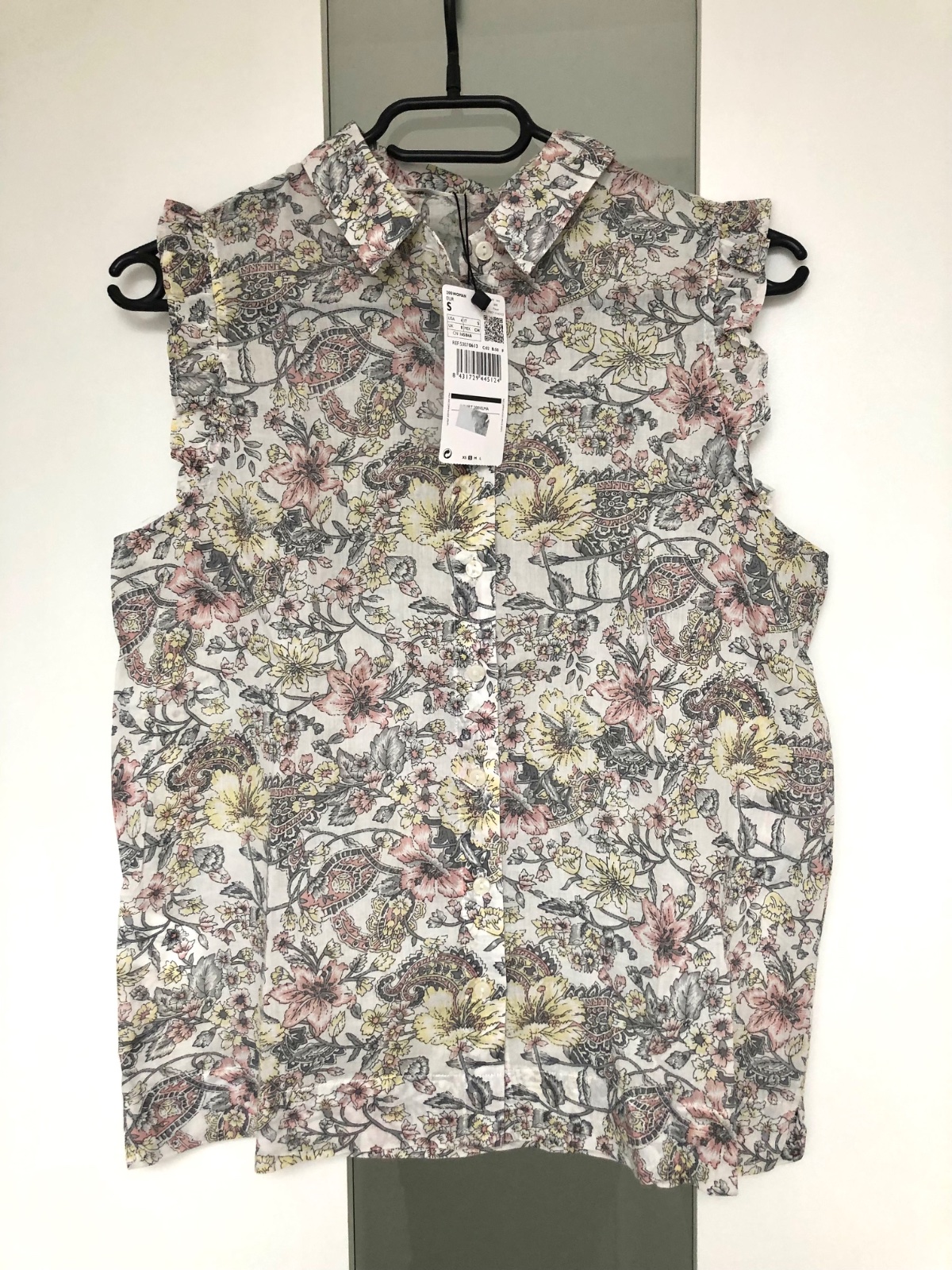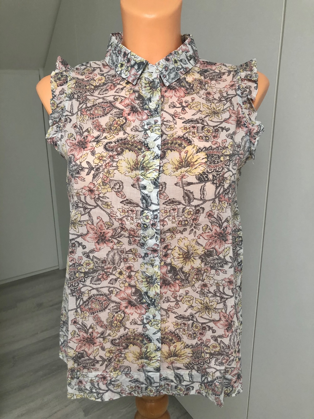 Nova, s visackou a nahradnym gombikom... Prekrasna letna bluzka, vpredu skladana, s malym stojacikom, skryte zapinanie...Prijemny tenucky materialik - trochu presvita....