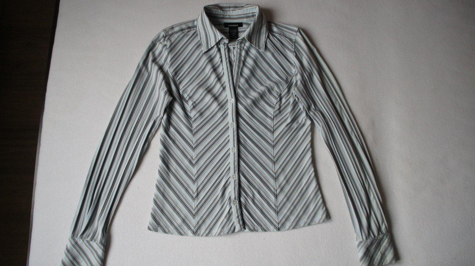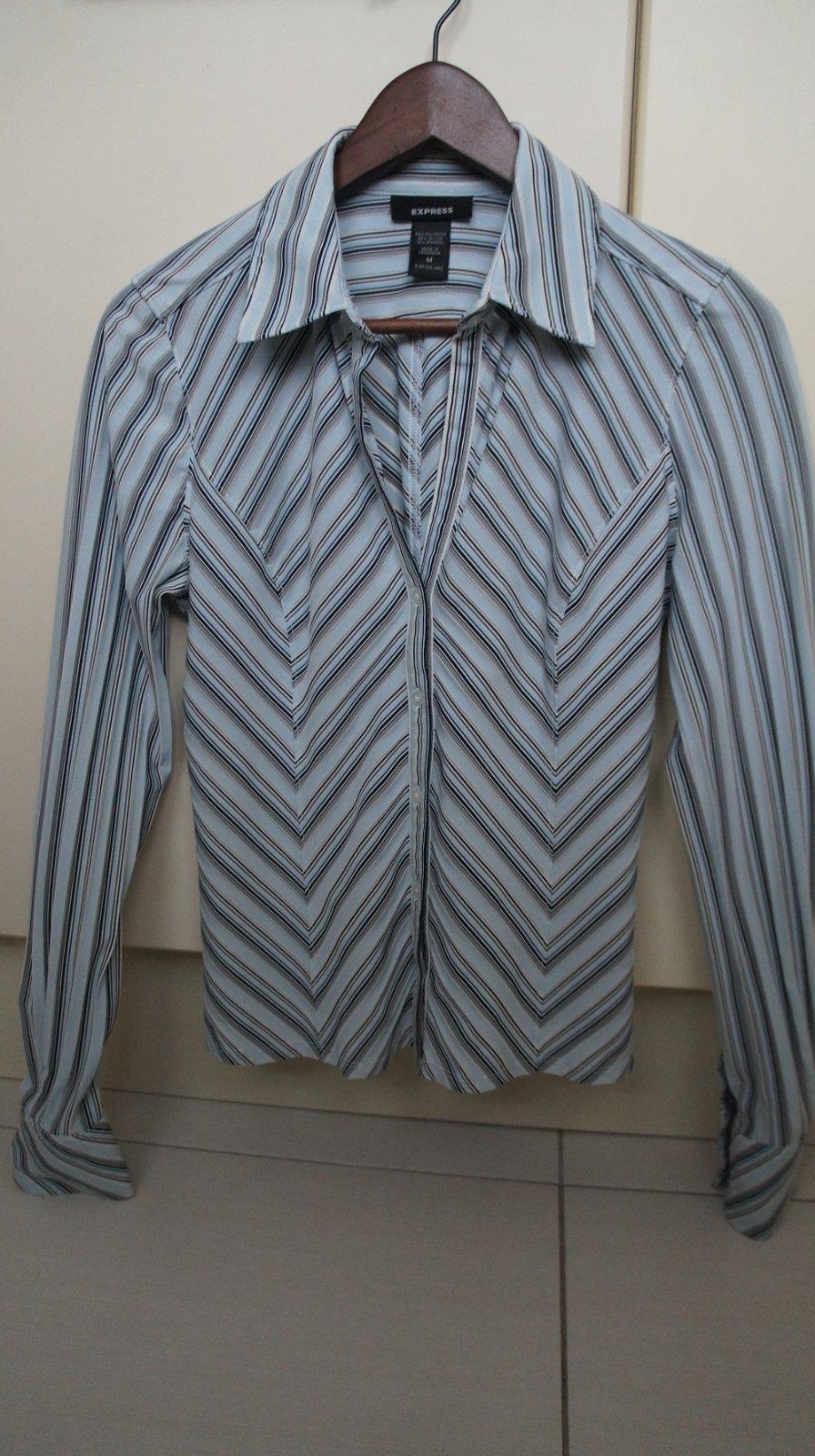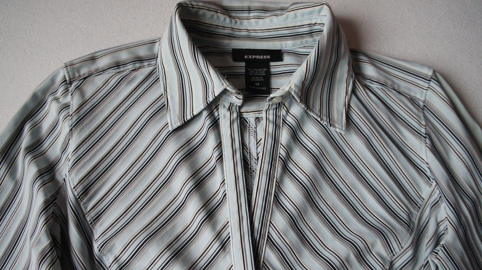 Predám túto dámsku košeľu, veľkosť M, značka Express, kupovaná v USA. Farba bledomodrá, v kombinácii s čiernou. Je strečová, elastická, prispôsobí sa. Zloženie: 49% polyester, 38% nylon, 13% spandex.