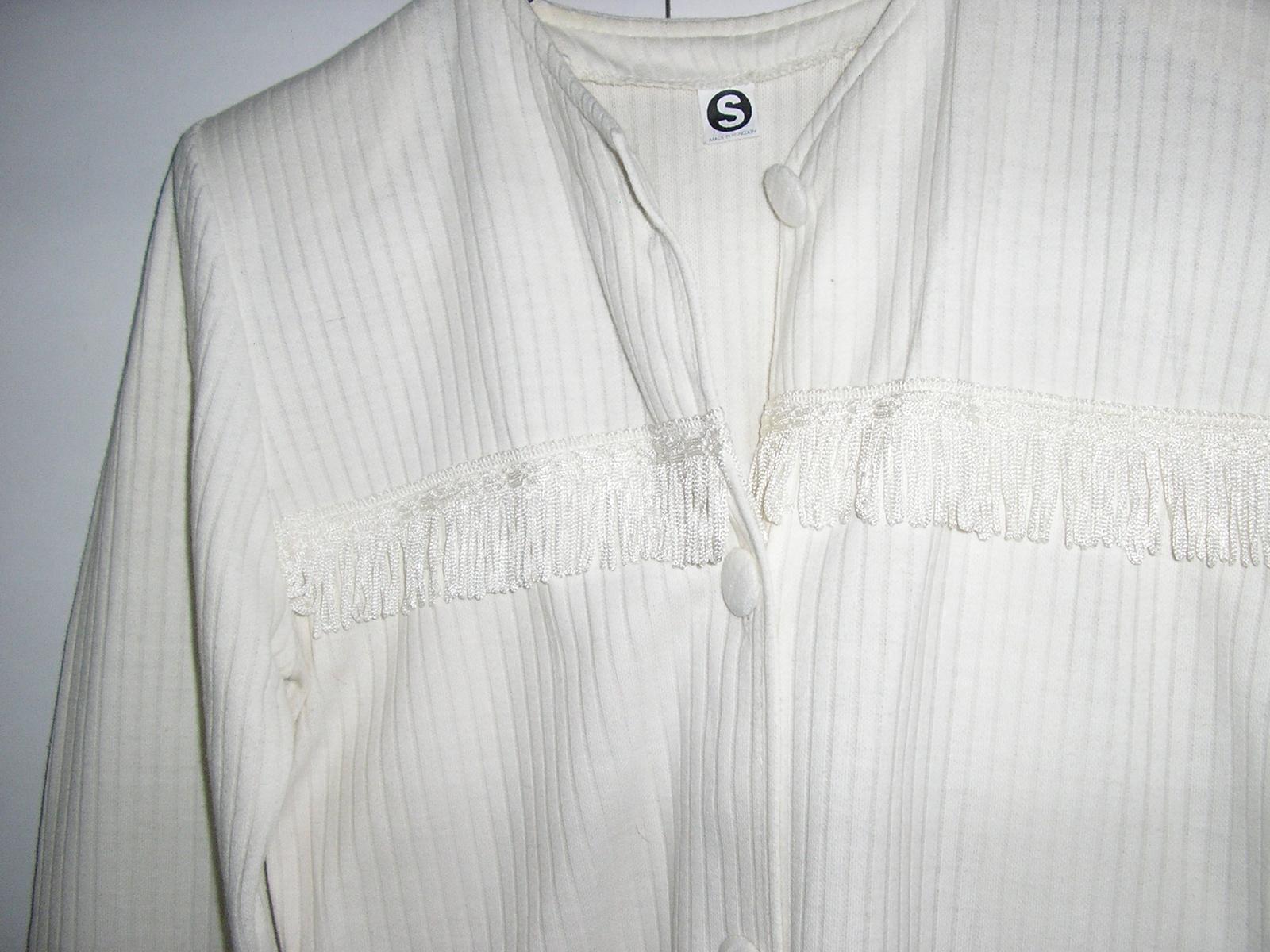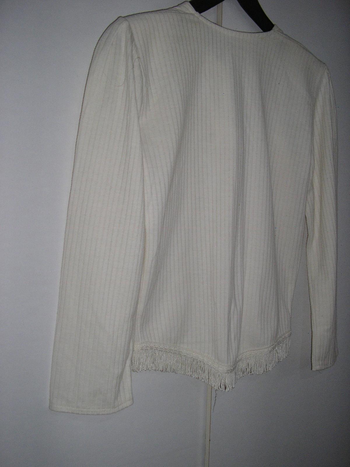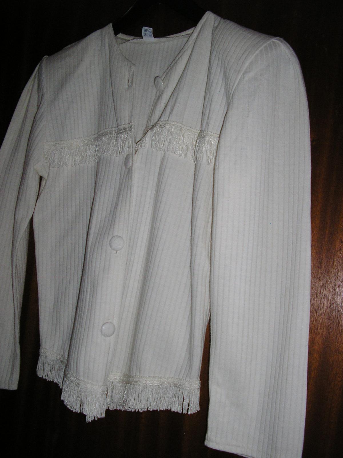 Biela blúzka alebo kabátik je mierne elastický. Okrúhly výstrih. Rukávy dlhé. Zapínanie na gombíky. Ozdobou sú strapce prišité na prednej časti, ako aj okolo dolného okraja. Mäkký a veľmi príjemný materiál.