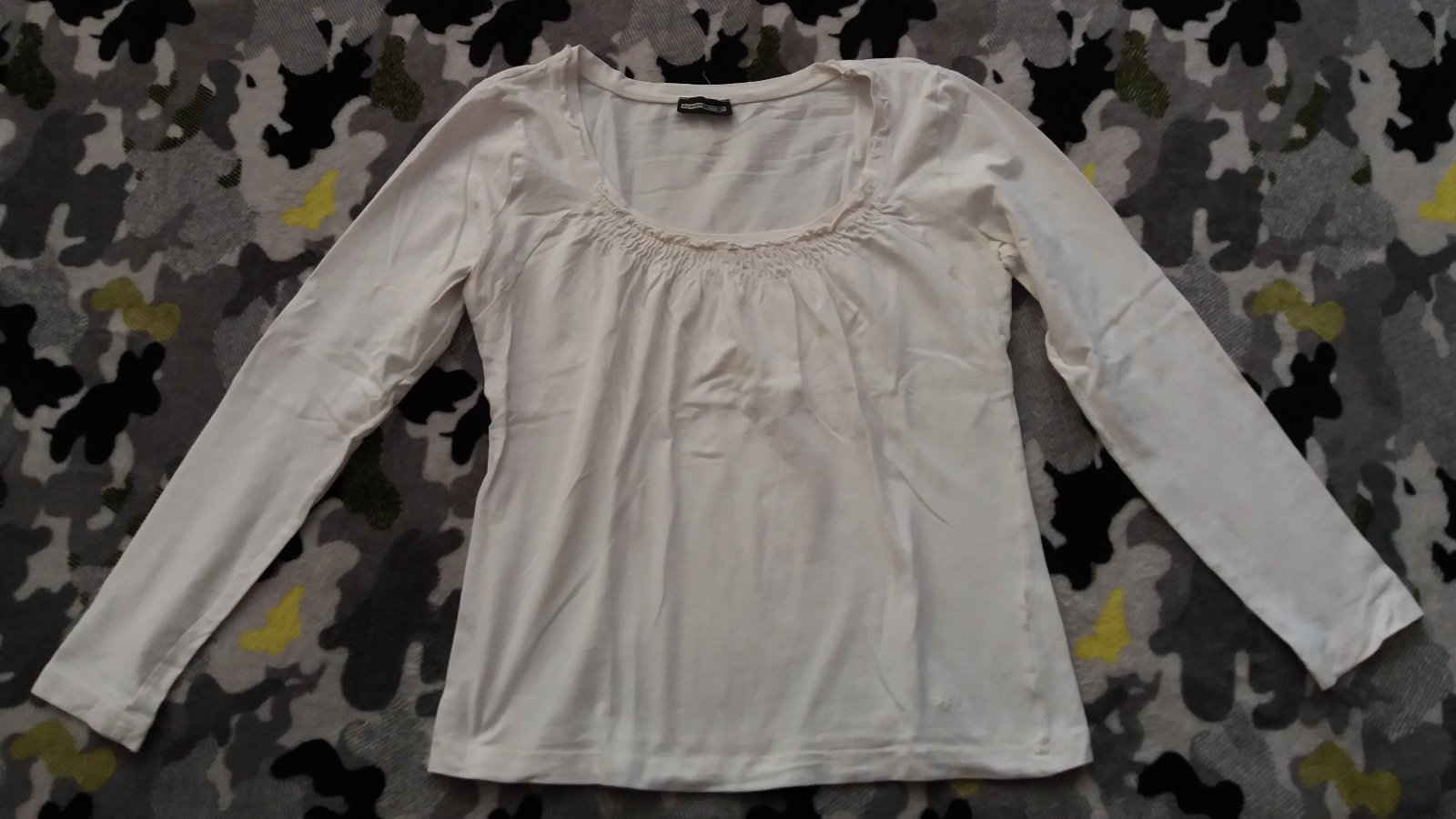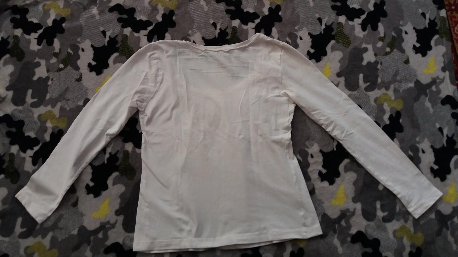 Biela blúzka.V predu volnejsia tým že je nariasená.Dl.54cm, š.43cm, rukáv 53cm +7cm plece.