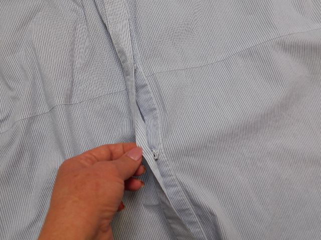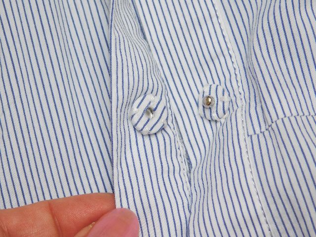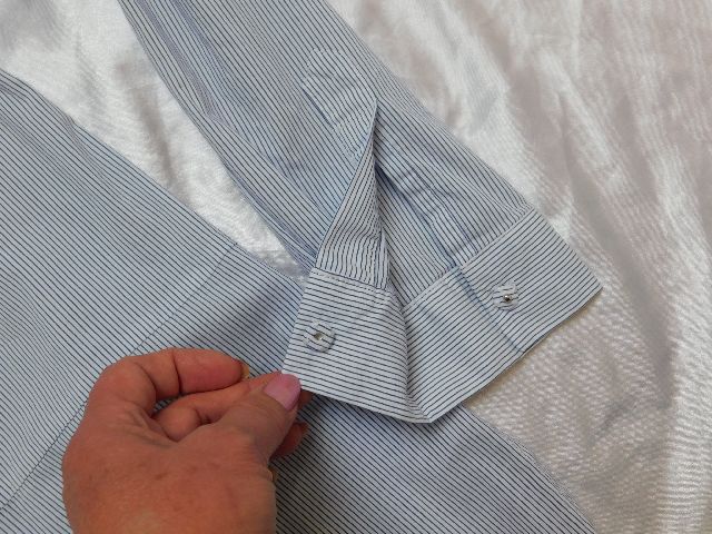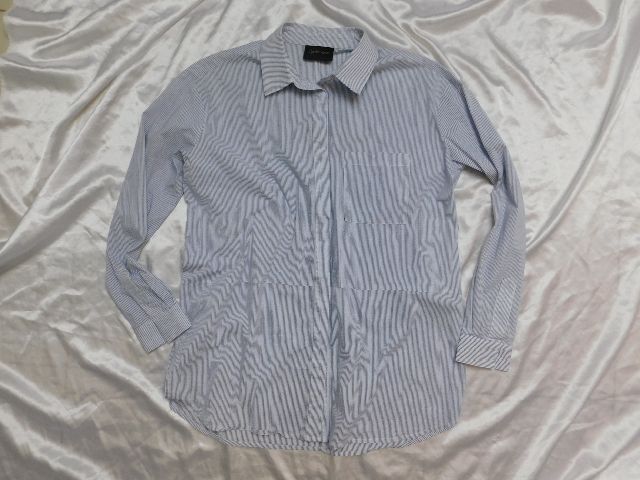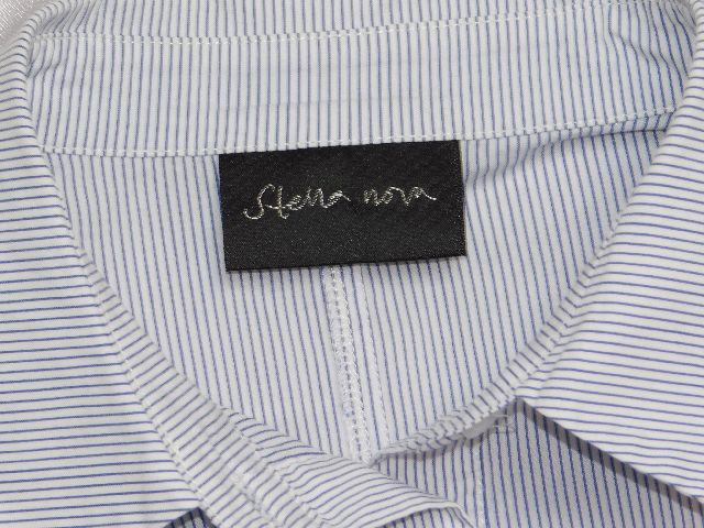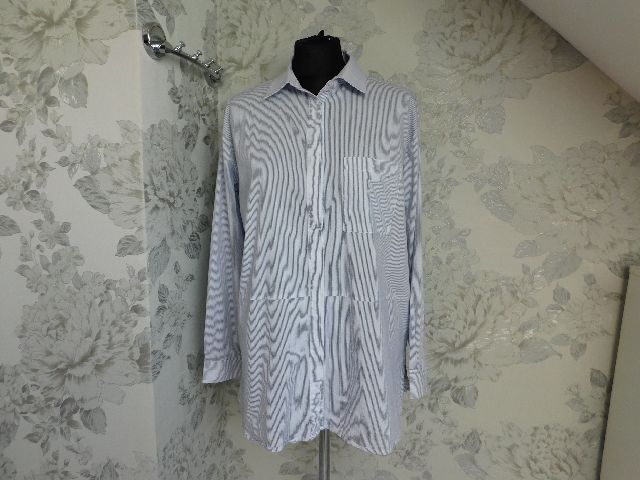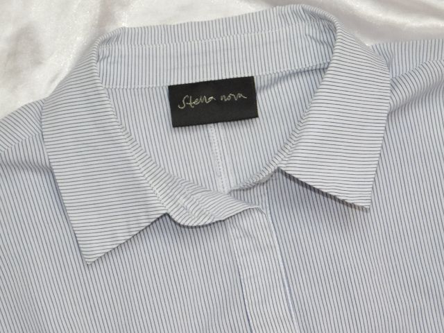 Luxusna košelova bluzka,bielej farby s nitovymi pasikmi modrej farby,bočne rozparky.68%cotton,27%nylon,5%elastan.PC 139€.super stav. se20