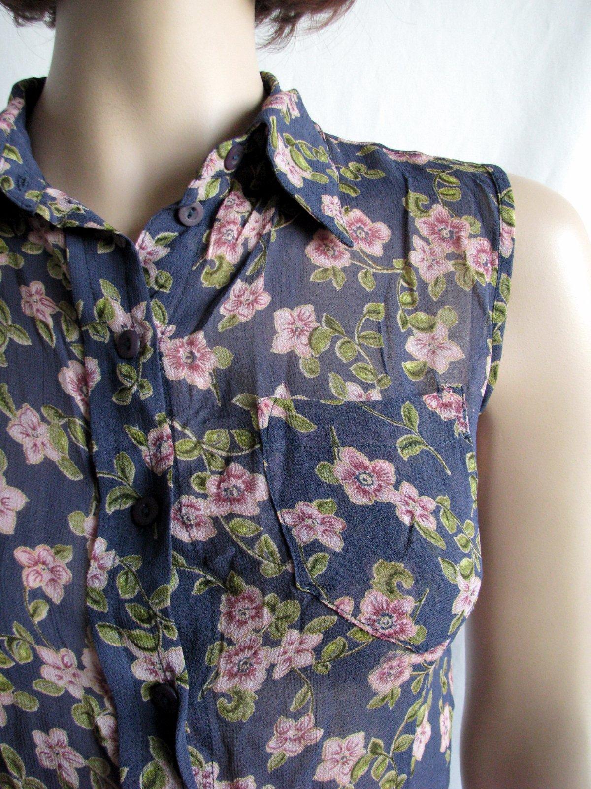 Tmavomodrá kvietkovaná priesvitná blúzka, s ružovkastými kvetmi. Zachovalá, bez poškodení. Veľkosť zodpovedá asi S, rozmery sú: