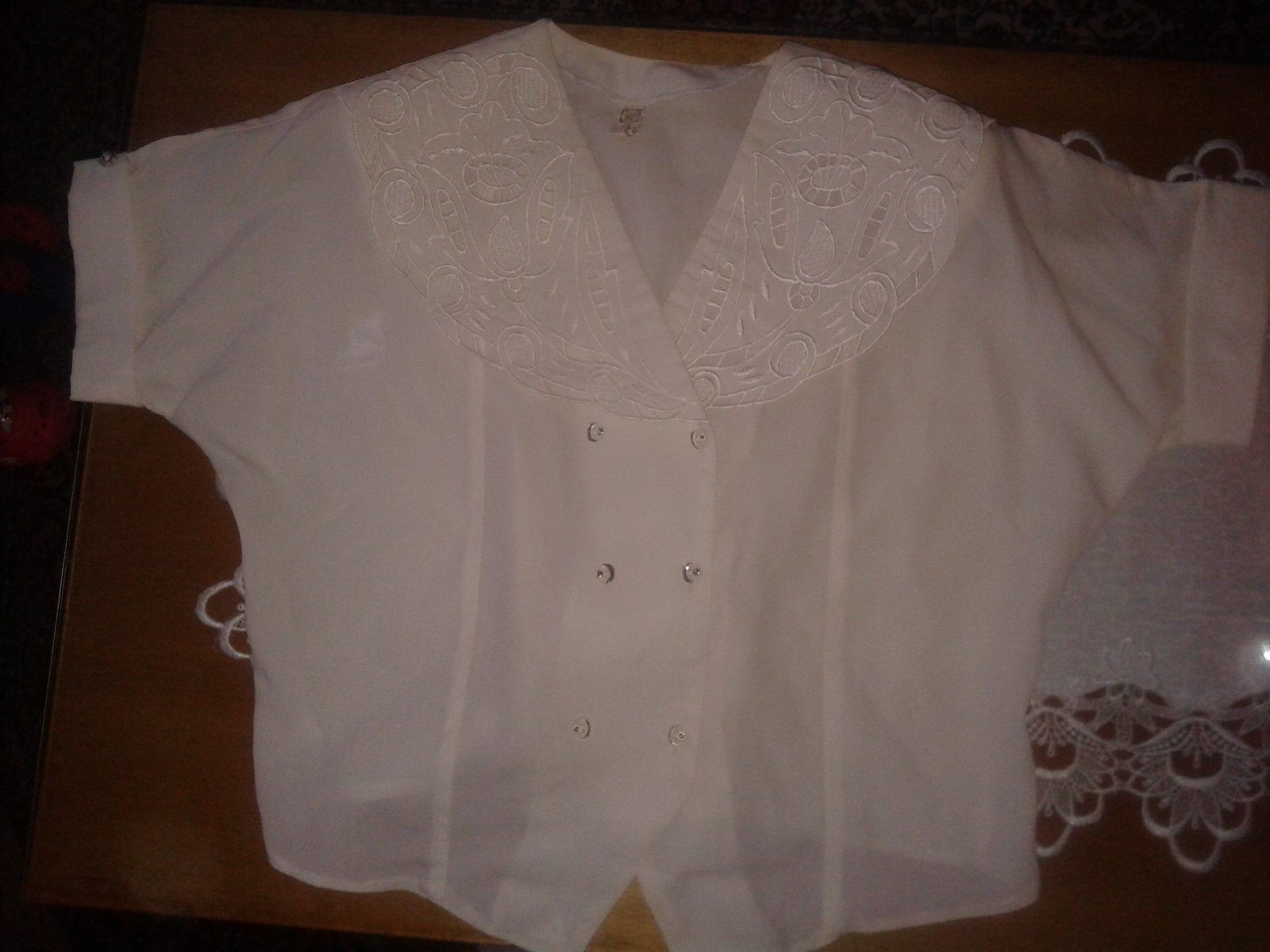 Krémova blúzka s vyšívaným golierom,dĺžka do pasu. Nosený, zachovalý stav bez poškodení.Šírka 5š cm dá sa zmenšiť zaviazaním vzadu.Dĺžka vzadu 48cm, vpredu je dlhšia.