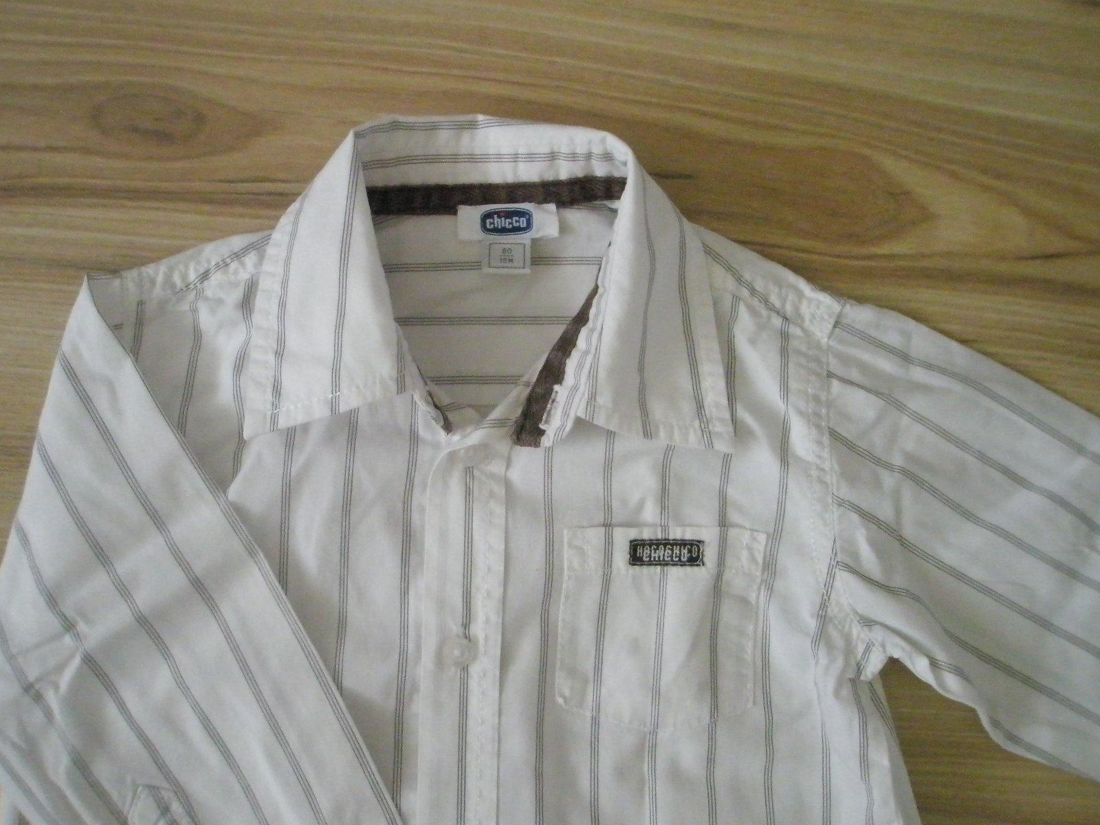 úžasná biela košielka s hnedými pásikmi, na gombičky, po bokoch má rázporky, veľkosť je uvedená 80, 15 mesiacov, dĺžka 24,5 cm, šírka 30,5 cm, rukáv 35 cm