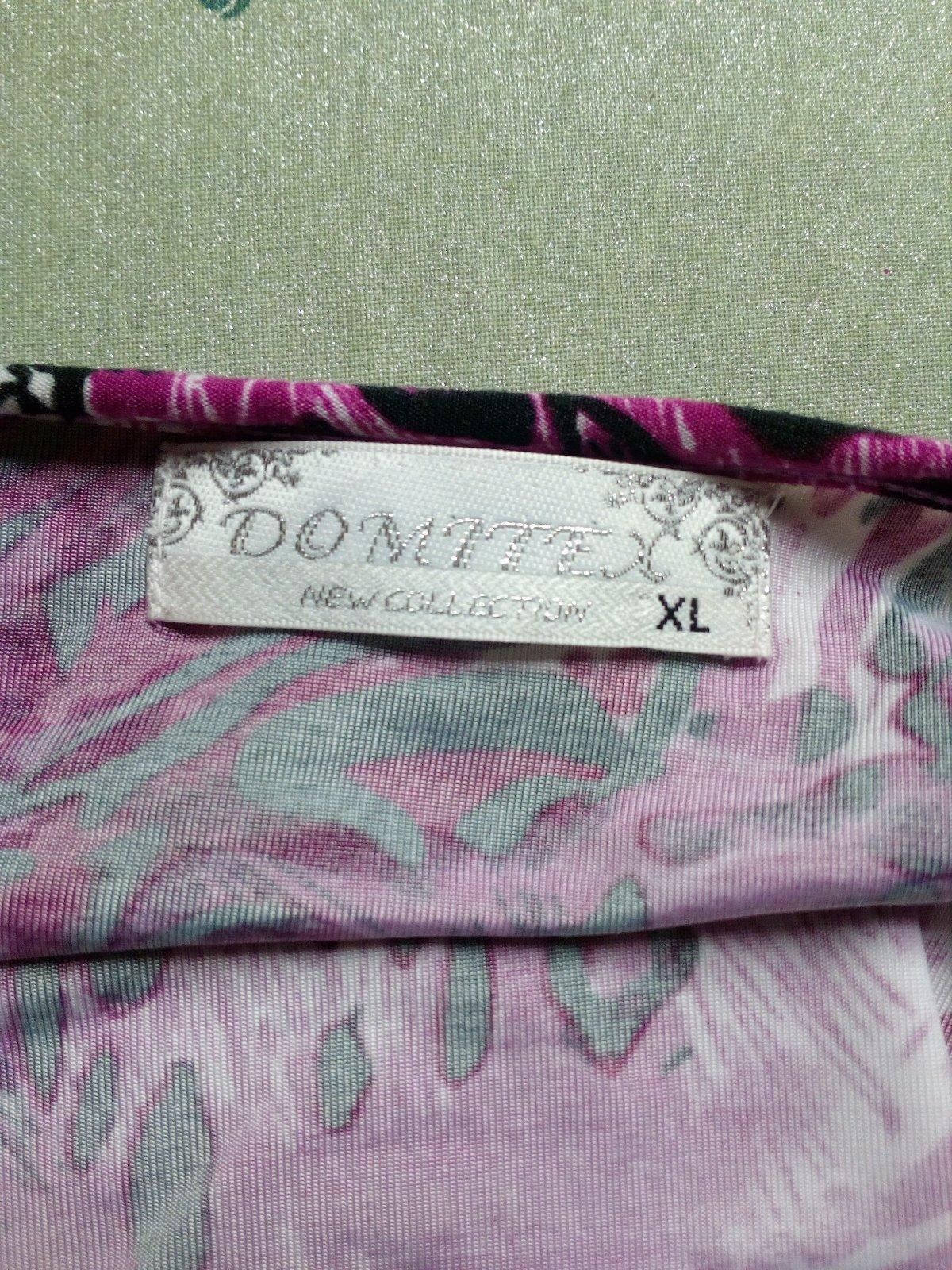 ako nova blúzka s 3/4 rukávom značky Domte. Blúzka je krásne sfarbená je na nej čierna, cyklámenová, biela a ružova farba. Hore na hrudníku sú 2 pásiky so striebornými prackami. Materiál je 60% viscoza, 35%bavlna a 5%elastan. Je príjemná na dotyk Po bokoch sú 10cm rázporky. Na pleciach sú vypchávky. Dĺžka je 68cm, obvod hrudníka je 55x2cm a obvod pása je 55x2cm. Blúzka je elastická