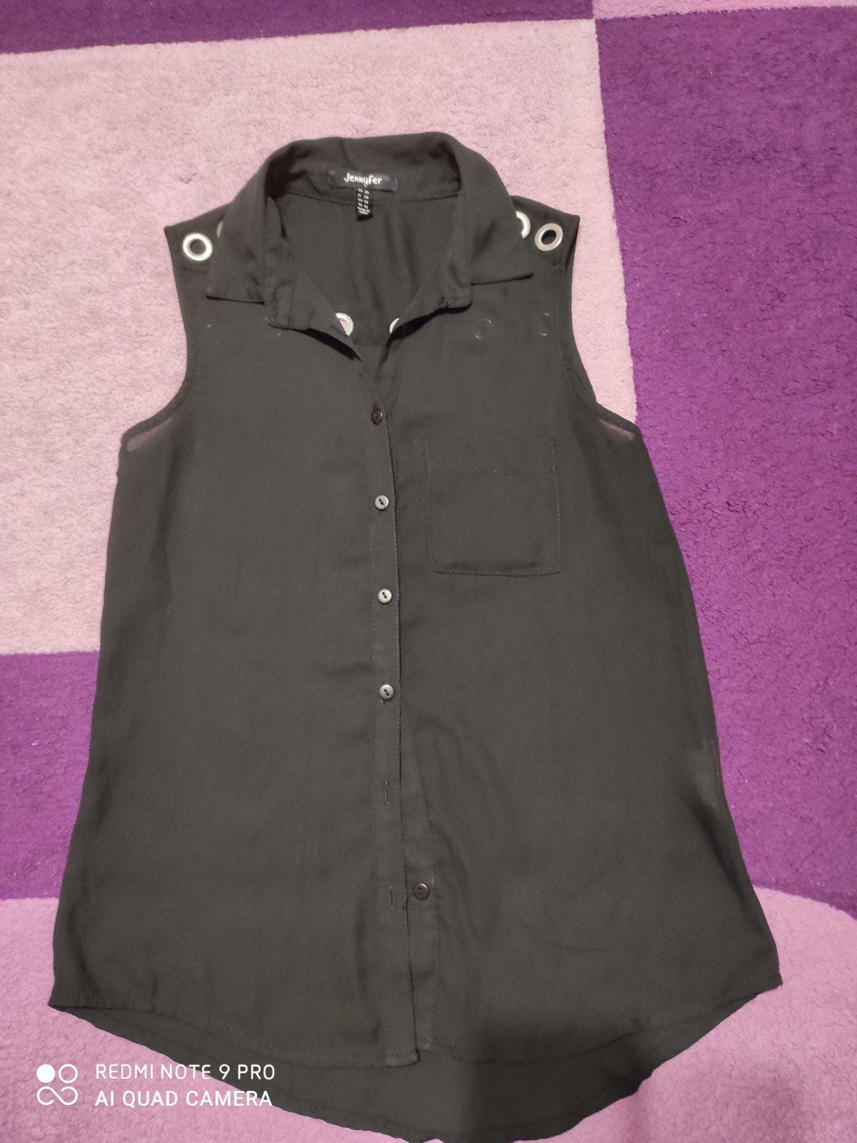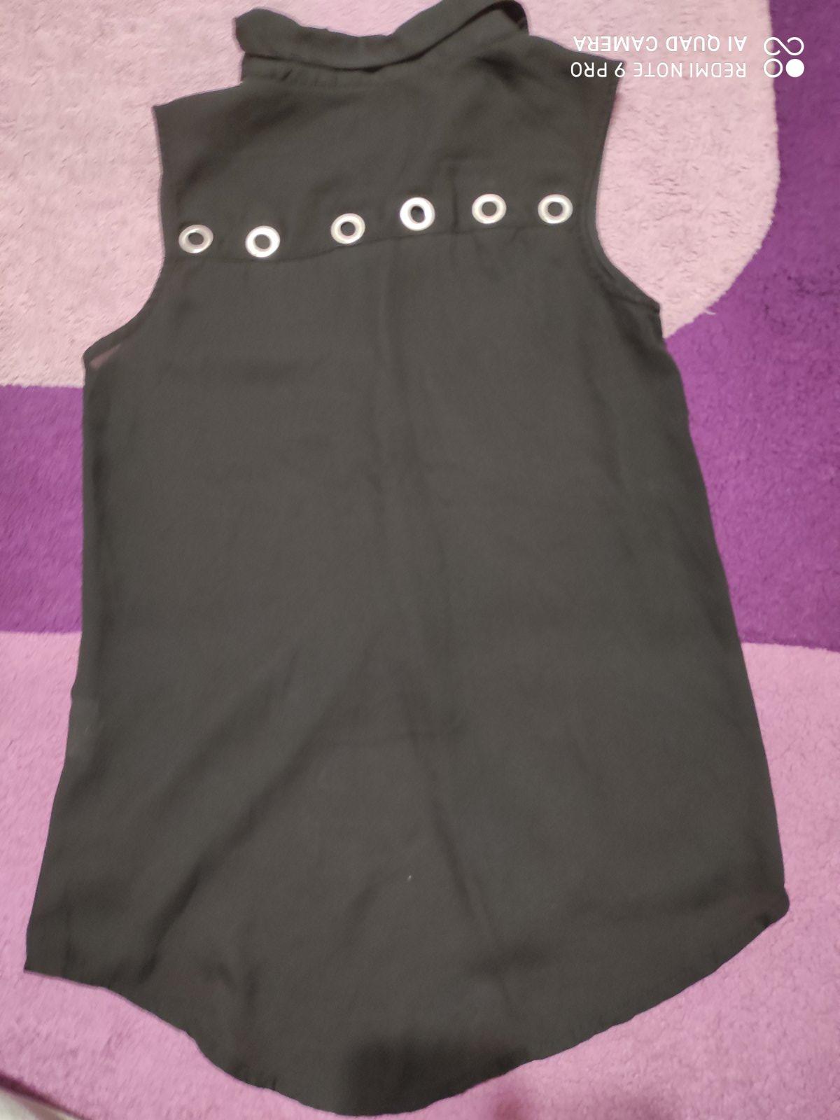 Veľmi dobrý stav! Dámska čierna blúzka bez rukávov, zapínanie vzadu na jeden gombík, nie je elastická, podšitá, materiál 100% polyester. ROZMERY: dĺžka meraná vzadu: 61cm, pod pazuchami meraná šír...