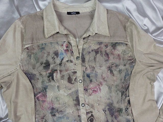 Luxusná béžová blúzka so zapínaním na gombíky, materiál sčasti úpletový, vpredu farebná čipka, super stav.