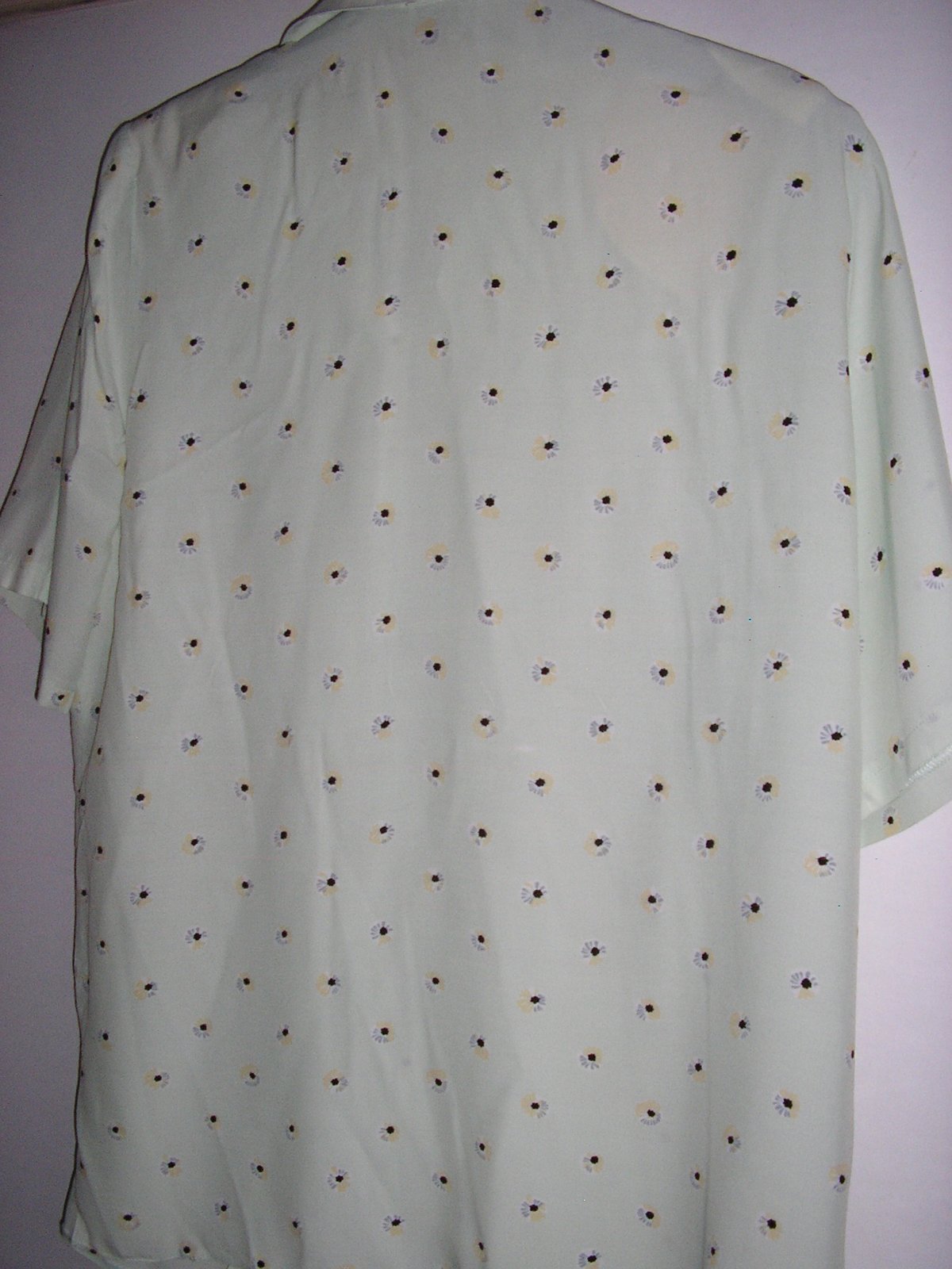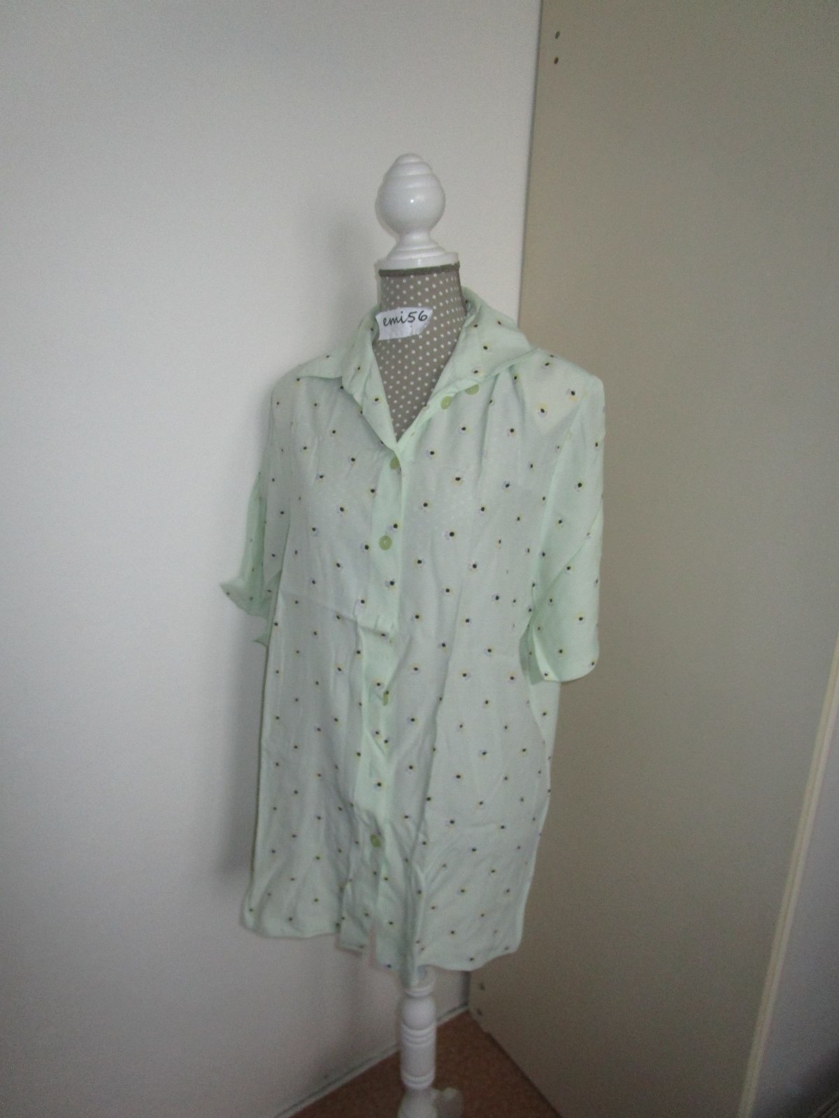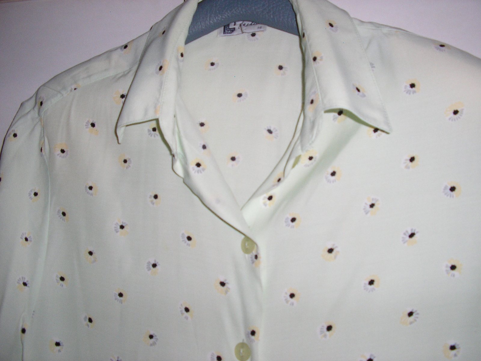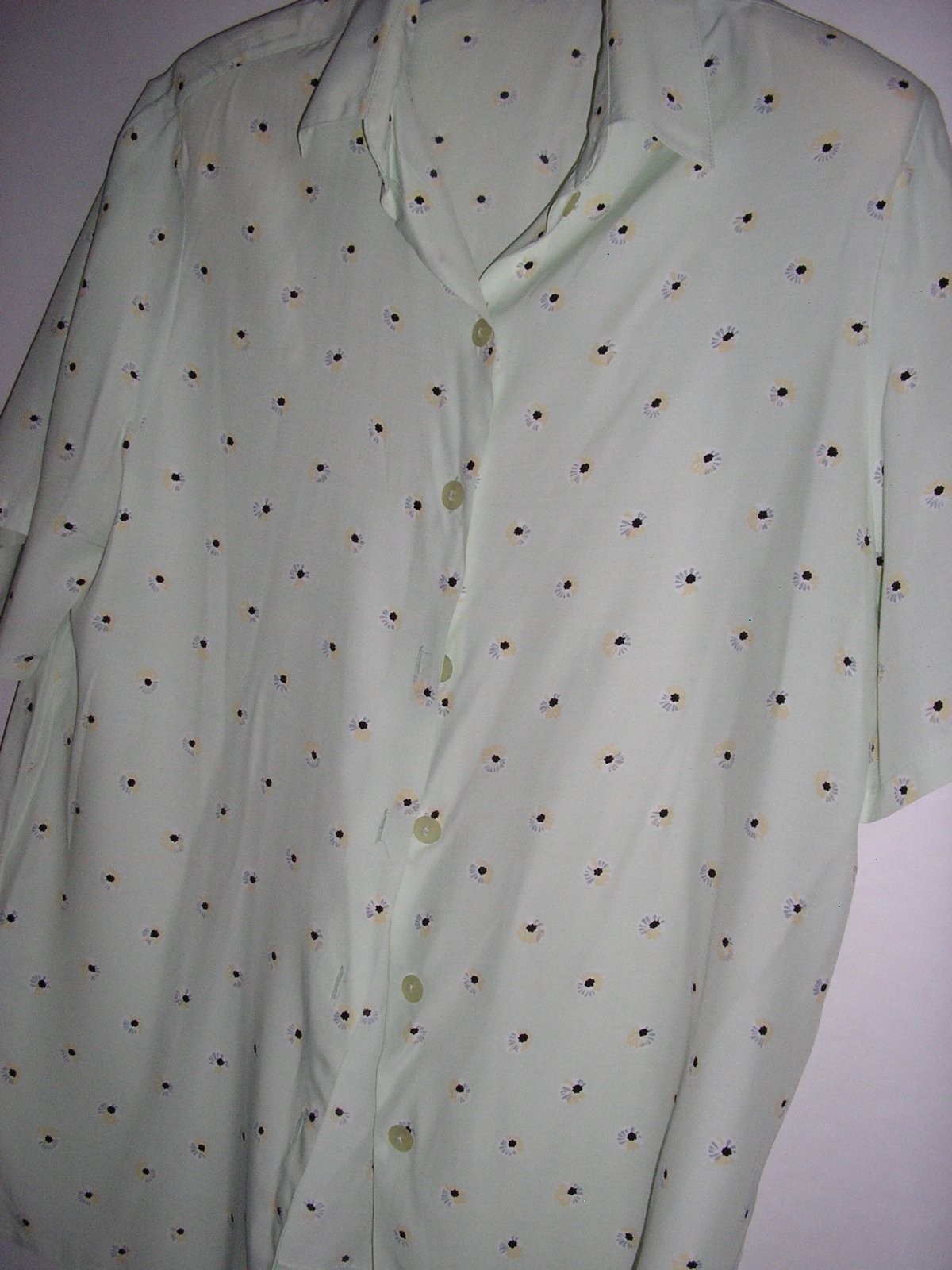 Jemne hráškovo zelená blúzka s krát. rukávom. Golier špicatý, zapínanie na gombíky. Strih rovný.