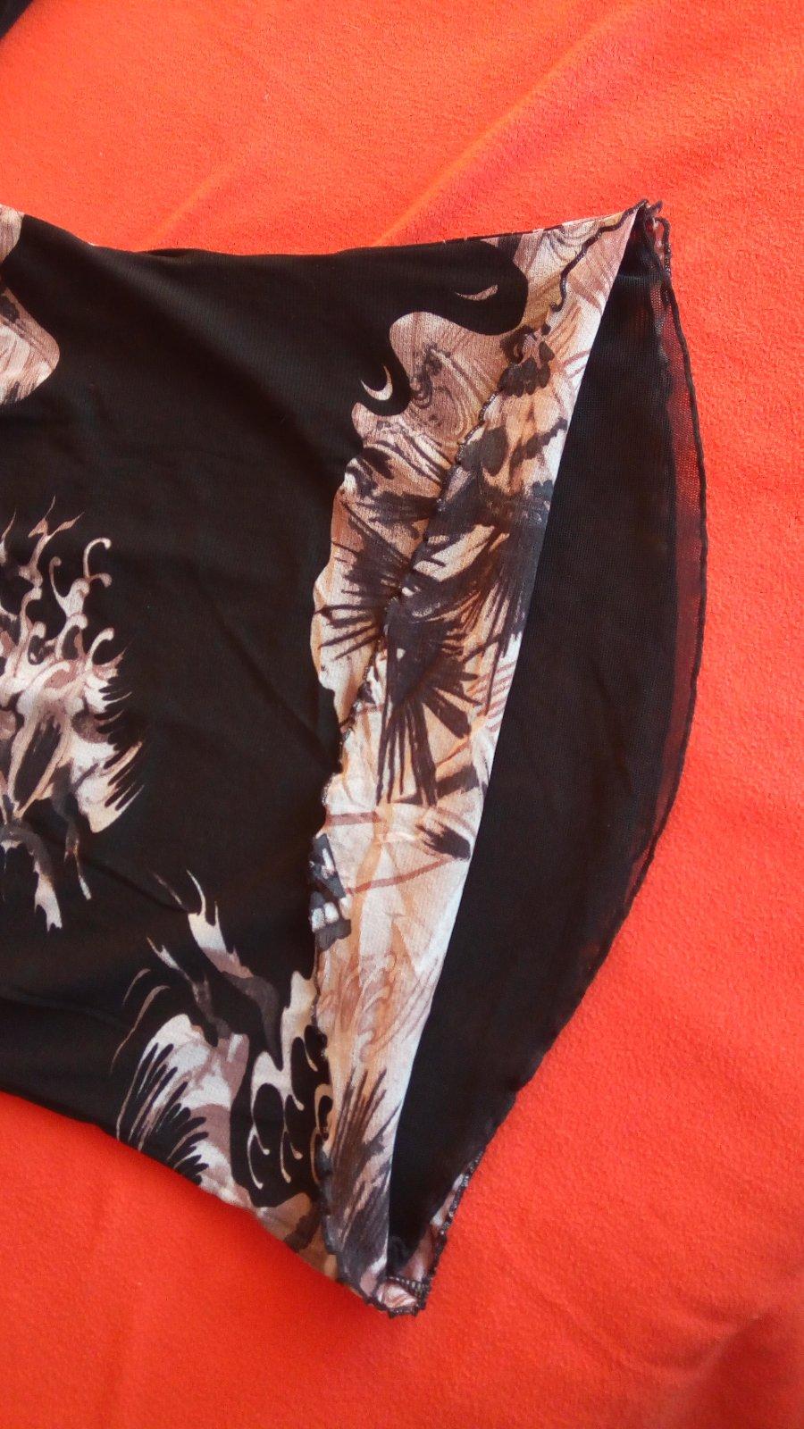 Zaujímavá blúzočka z pružného úpletu, telo má podšívku, rukáv lakťový, mierne rozšírený, trochu priesvitný, v peknom stave.