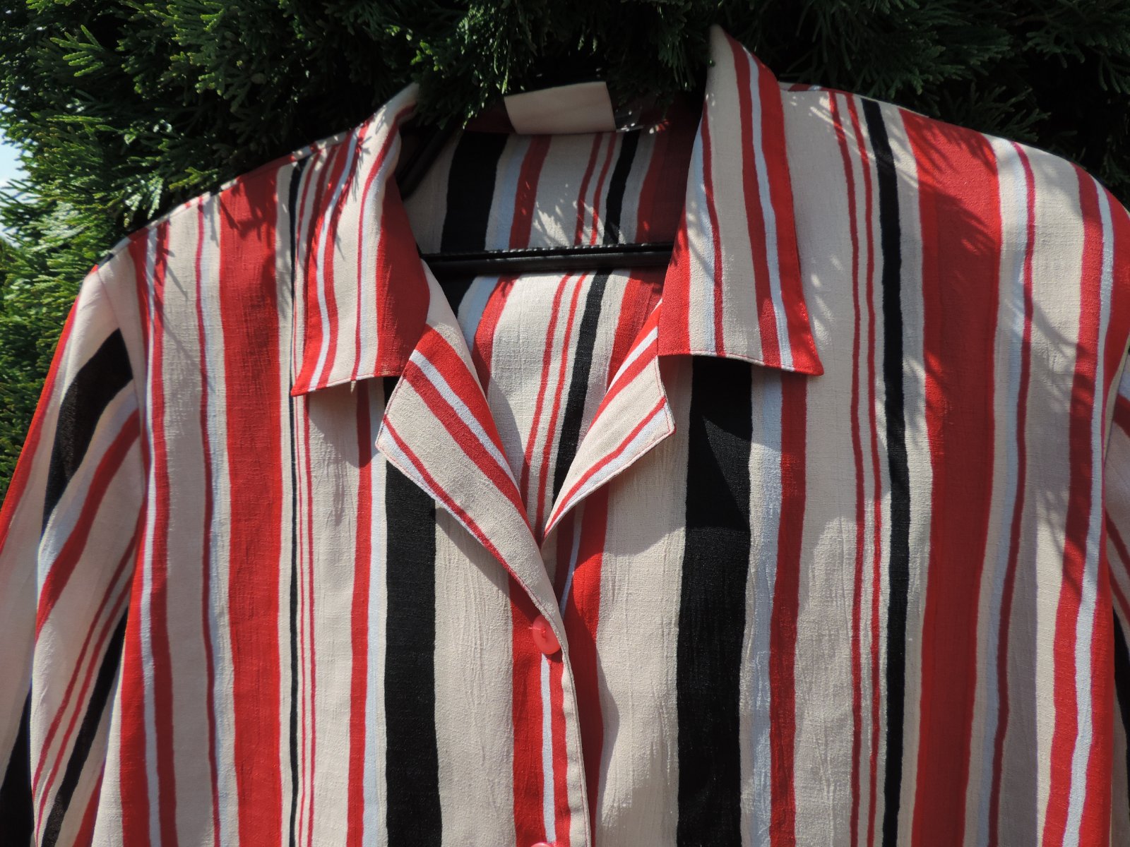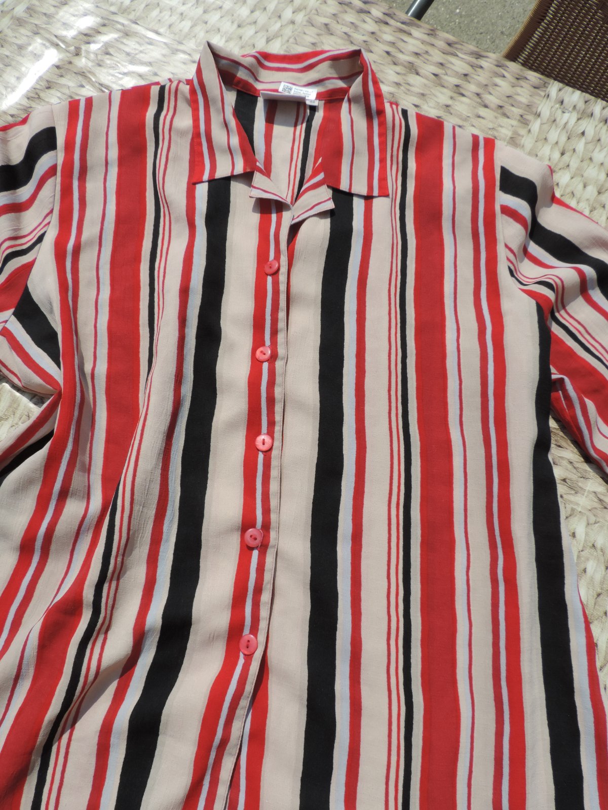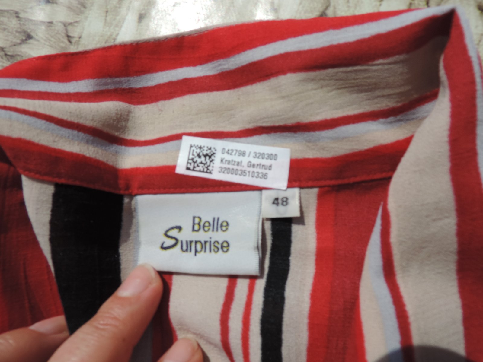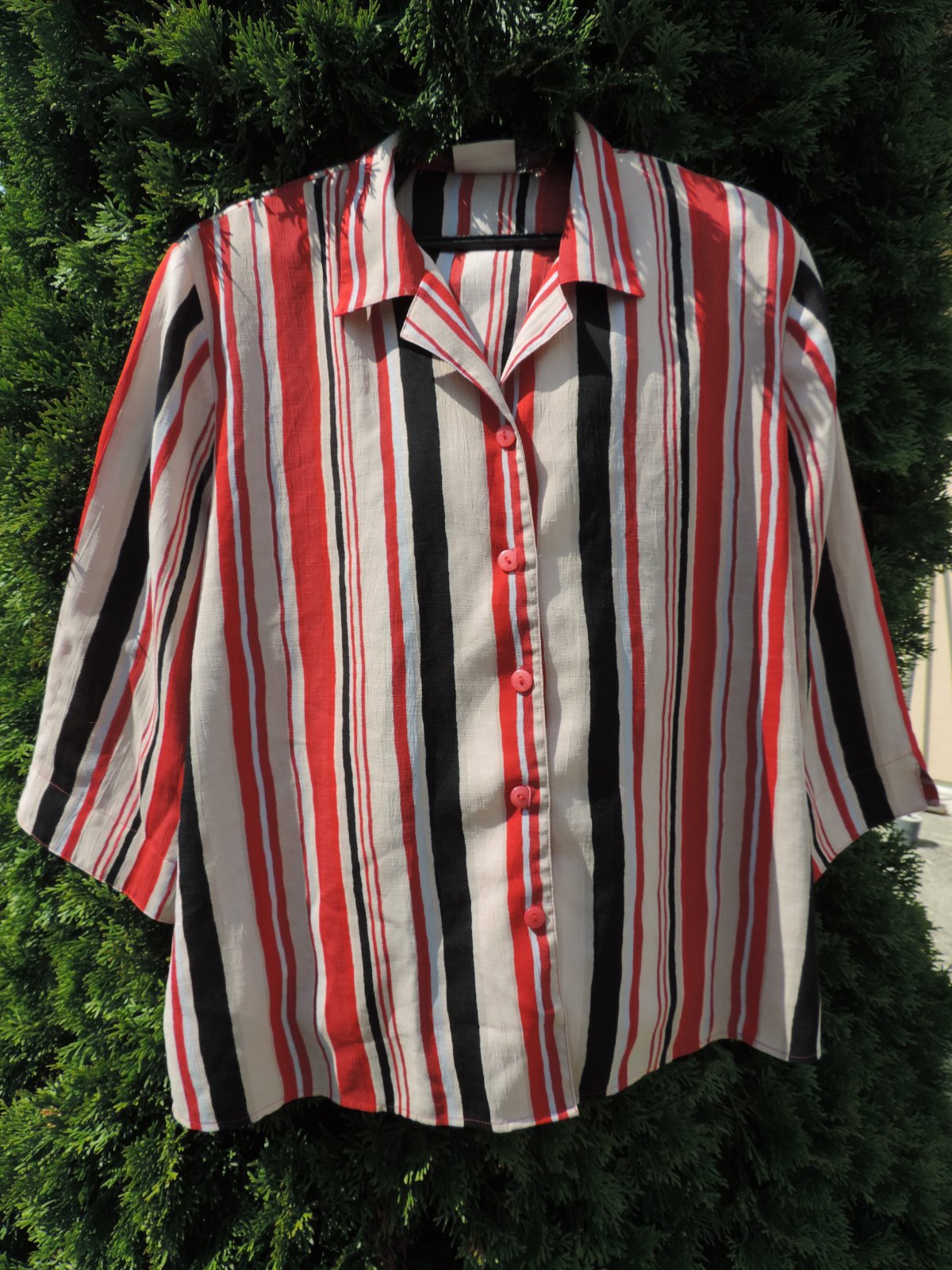 Pekná blúzka sýtych farieb, príjemnej farebnej kombinácie, zn. Belle Surprise, dovoz. Pre pevnejšie dámy, veľ. 48, rukáv 3/4 ťový. Bez poškodenia. Šírka v prsiach je 2x64 cm, celková dlžka blúzky od ramena je 68 cm. Dĺžka rukáva od podpazušia je 27 cm. Naspodu po bokoch malé rozparky.