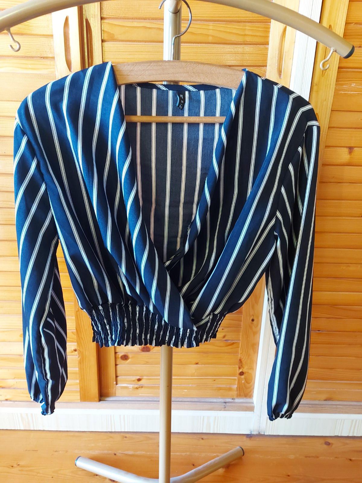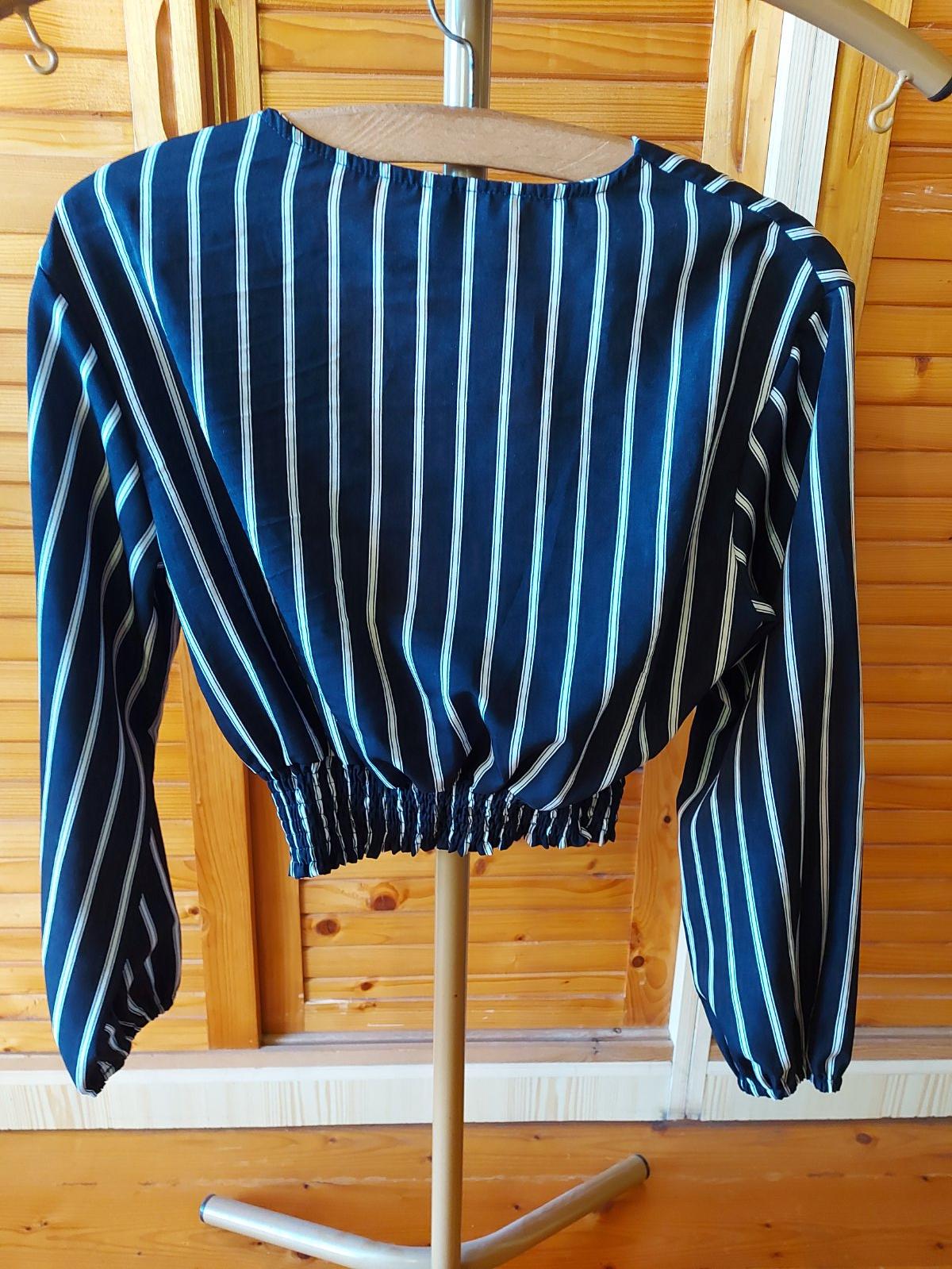 Pruhovaná modro-biela blúza do pásu z príjemného padavého materiálu, v prednej časti ako keby zavinovacia, dolu ukončená ozdobnou širokou gumou-viď foto, rukávy tiež ukončené gumou, š. pod pazuchami v kľude-44, d. zadného dielu-44, d. rukáva - 53