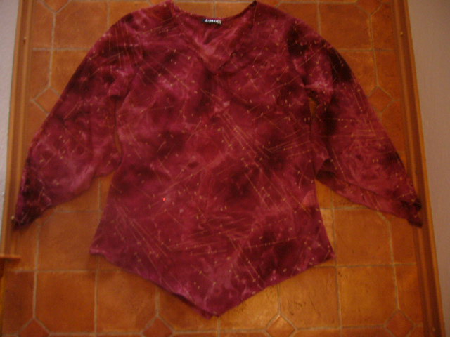 Uplne zachovala bordova tunika s vystrihom do večka.Miery cez prsia 42x2.Dlzka tuniky po najdlhsiu cast je 70cm dlzka rukava po najdlhsiu cast je 56 cm.