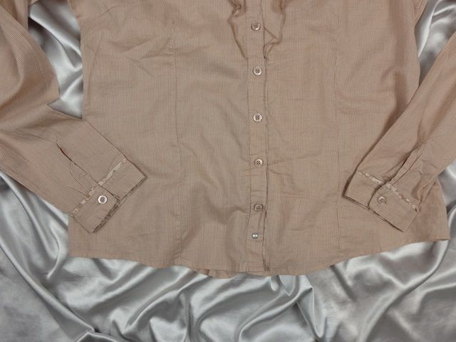 Kvalitná dámska blúzka pudrovoružovej farby, jemný pásik, zapínanie na gombíky, výstrih lemovaný volánikami, materiál 100% bavlna, super stav.