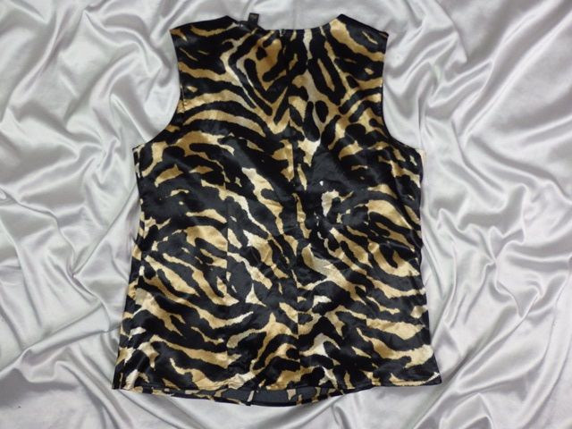 Kvalitný letný saténový top, čierno-zlatej farby, zvierací vzor, nariasený predok, materiál 97% polyester, 3% elastan, super stav.