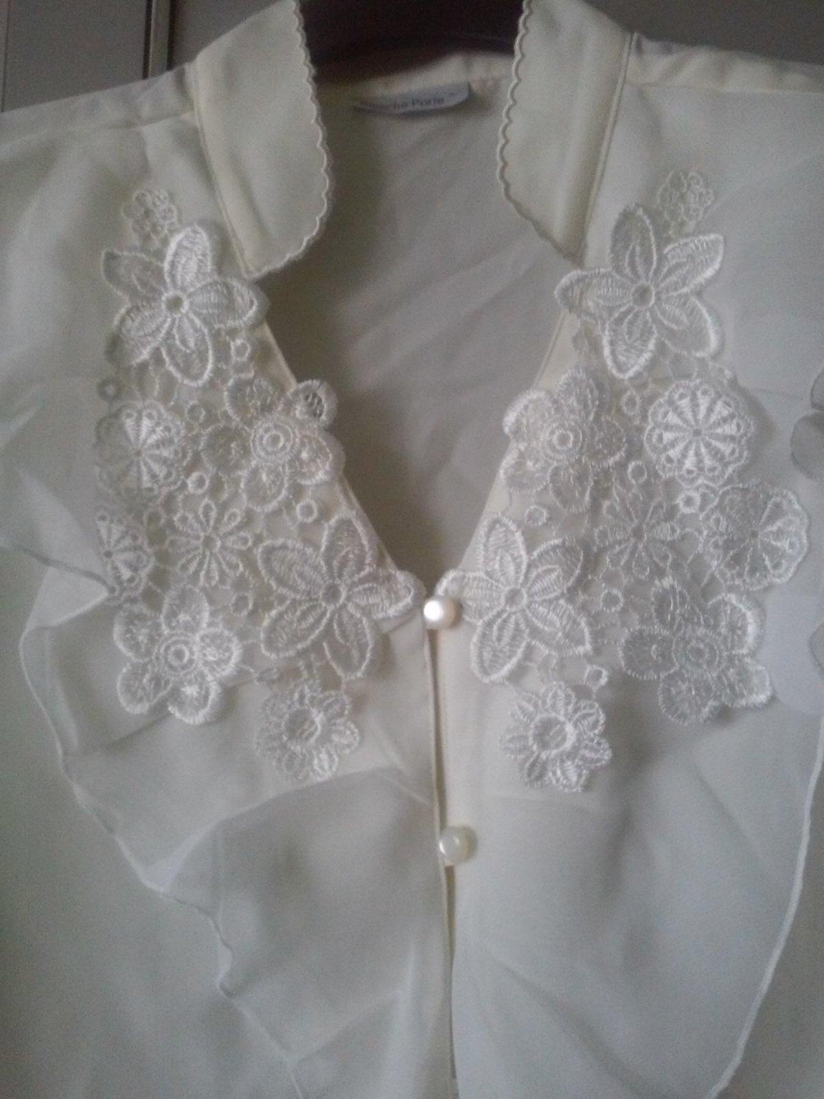 Šírka - 56, dĺžka - 66, trojštvrťový priesvitný rukáv. Na prsiach zdobené krajkou