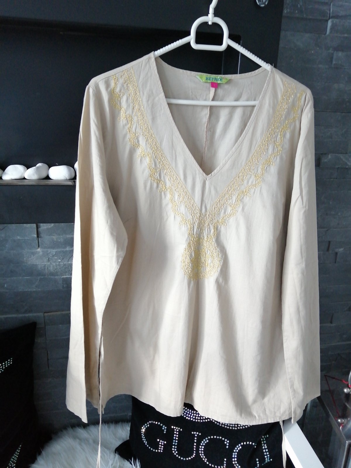 Vyšívaný topík pôsobí slávnostne , značka SALOOS veľkosť L (skôr 42), pružná látka, jemne maslová farba. Bez vád, len je mi široký.