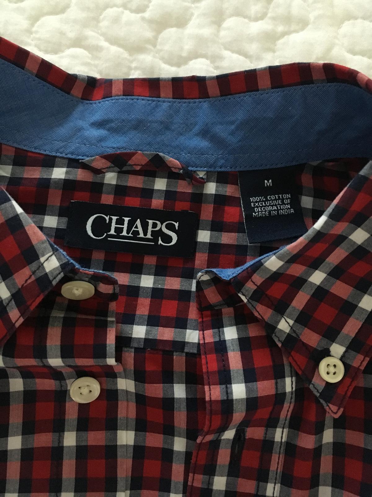par krat oblečená, muz z nej “vyrástol”, pekná k rifliam alebo slušným nohaviciam. Farba bordovo tmavomodra a biela. Chaps je americká značka, úroveň ako RL. Dĺžka rukáva s ramenom 76, pazuchy 58, dĺžka 78.