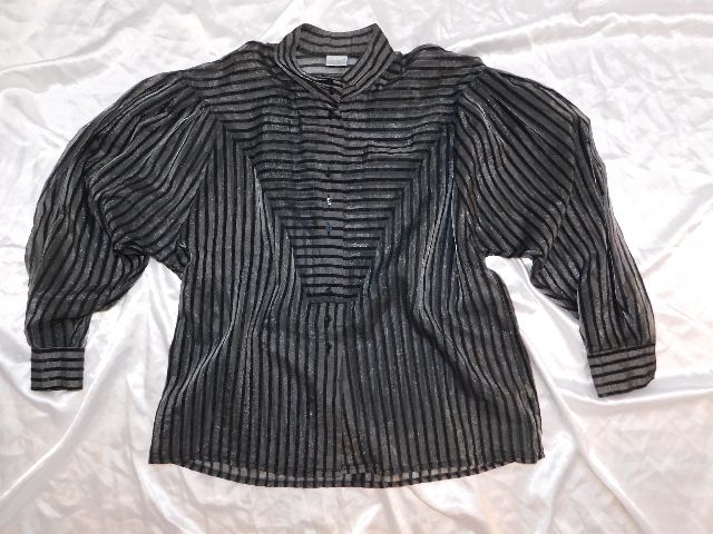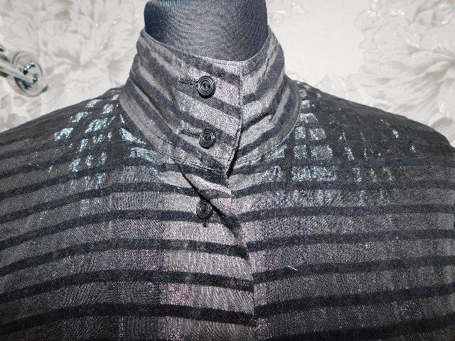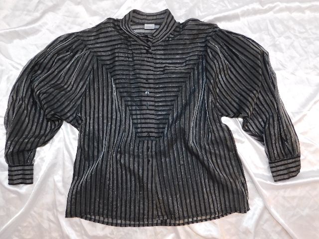 Pekna vintage bluzka,šedej farby,presvitny material s zamatovymi pasikmi.62%polyester,38%polyamid.super stav.