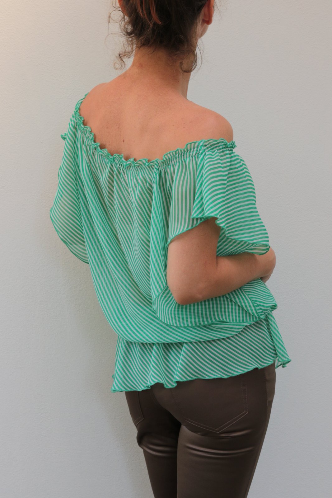 Voľný top Steps, z jemnej pruhovanej látky - biele a mentolové drobné šikmé prúžky. Okolo výstrihu a v páse je gumička, okolo rukávov až k pásu efektné volánky-kridelká. Top vyzerá skvele keď sa nosí asymetricky na jednom rameni, anebo s napol spadnutým výstrihom. Super stav ako nový. Veľkosť značená M, ale je značne univerzálny. Rozmery rada zašlem. Poštovné 2,5€.