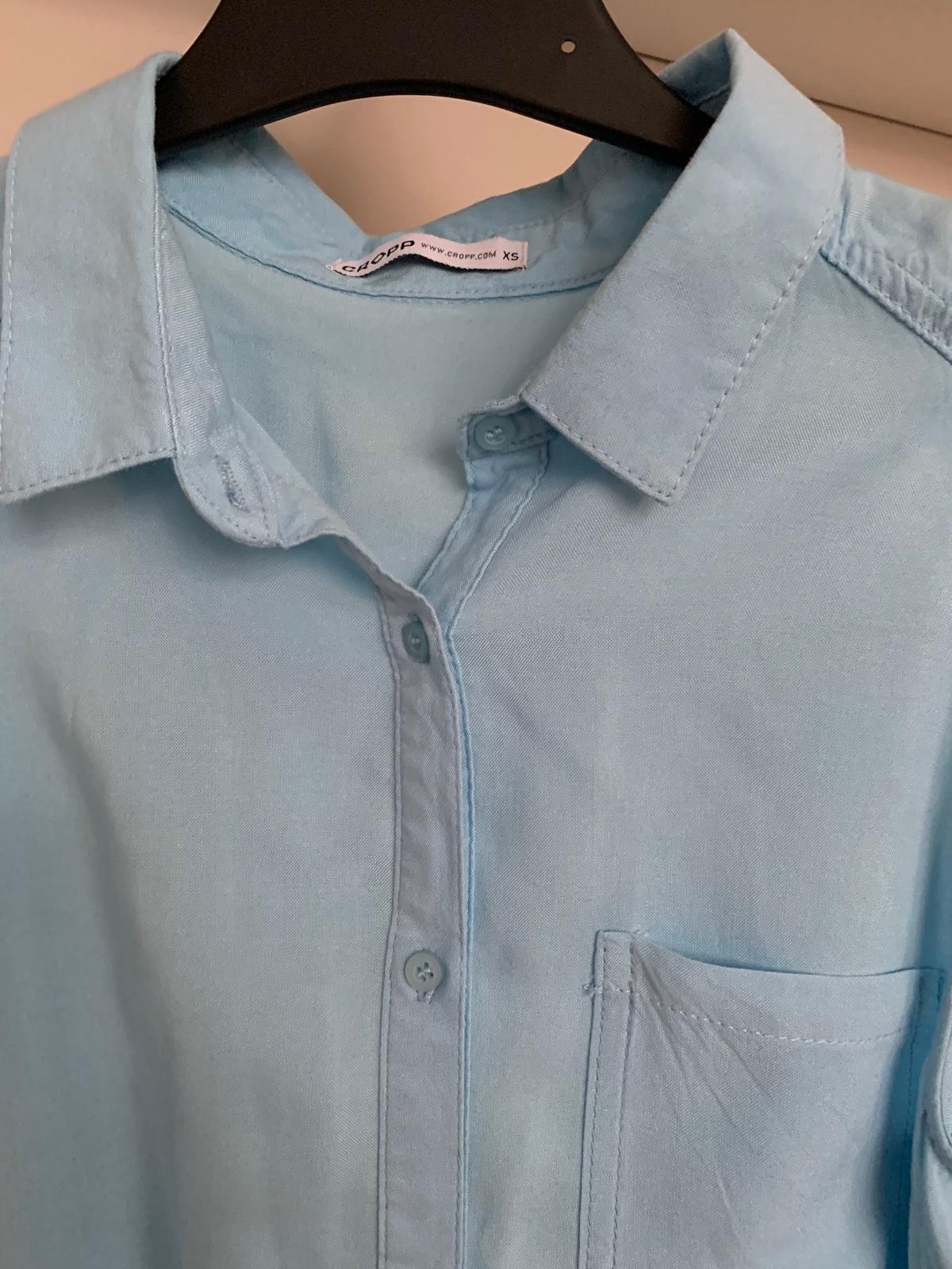 Jemnulinká blúzička vo farbe baby blue, s volánikmi aj na rukáve. Vzadu na jeden gombíček. Zn. Lumine, sedí na drobnú postavičku XS max. S s menšími prsami. Raz vzatá.