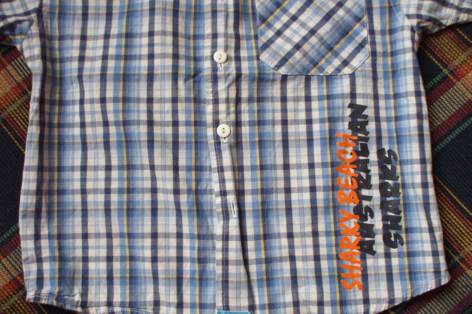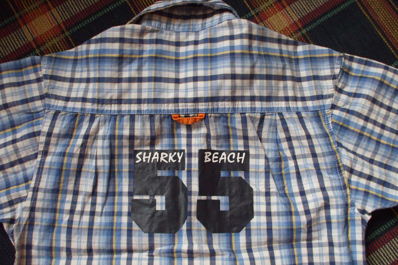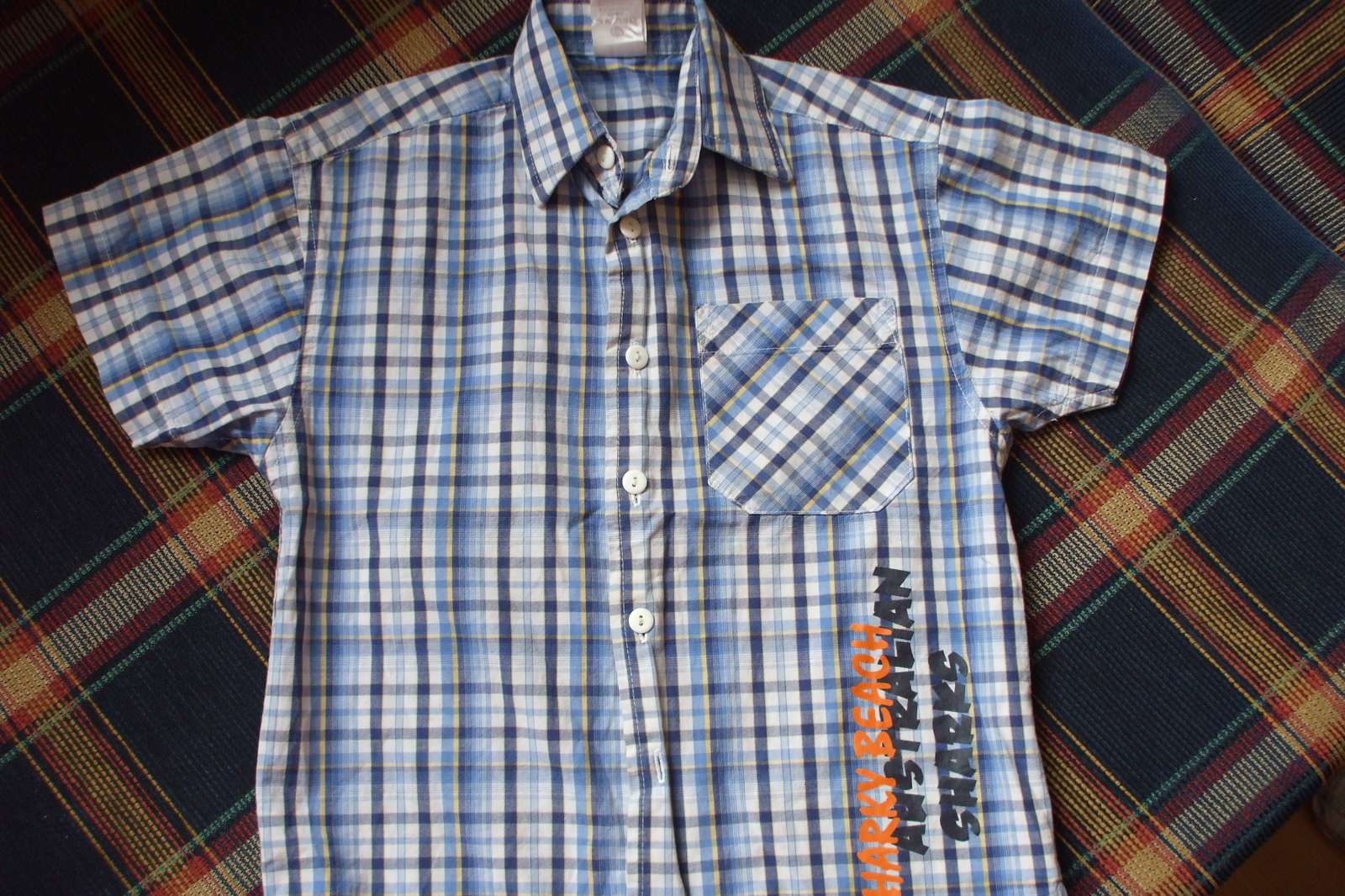Úžasná ľahučká letná košeľa pre frajera. Krásne vyzerá, aplikácia vpredu aj na chrbátiku, super stav, sýte farby.