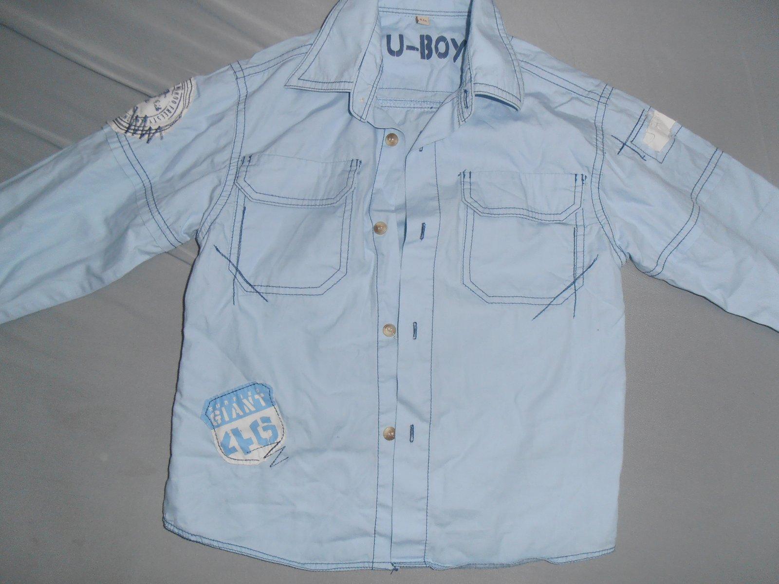 Predám frajerskú košieľku bledomodrej farby s nášivkami. Veľkosť 5-6 rokov.