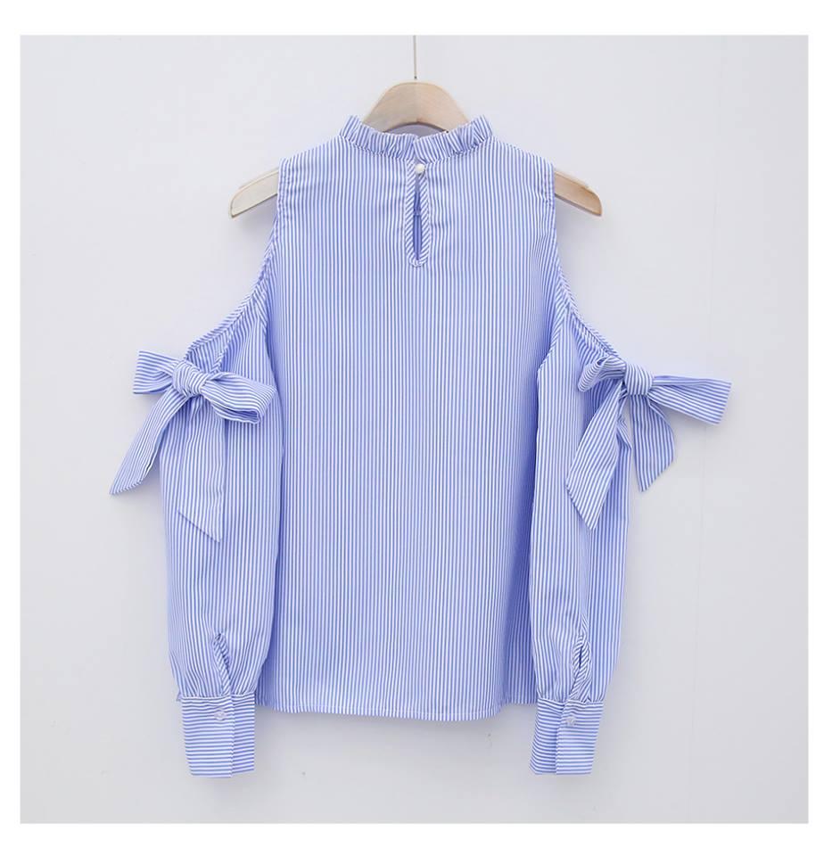 krasna bledunko modrá bluzka s jemnymi pasikmi s odhalenymi ramenami a golierom so stojacikom , velkost L