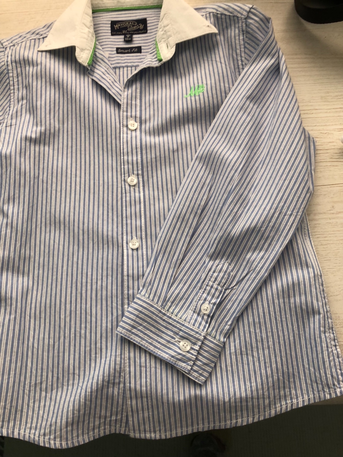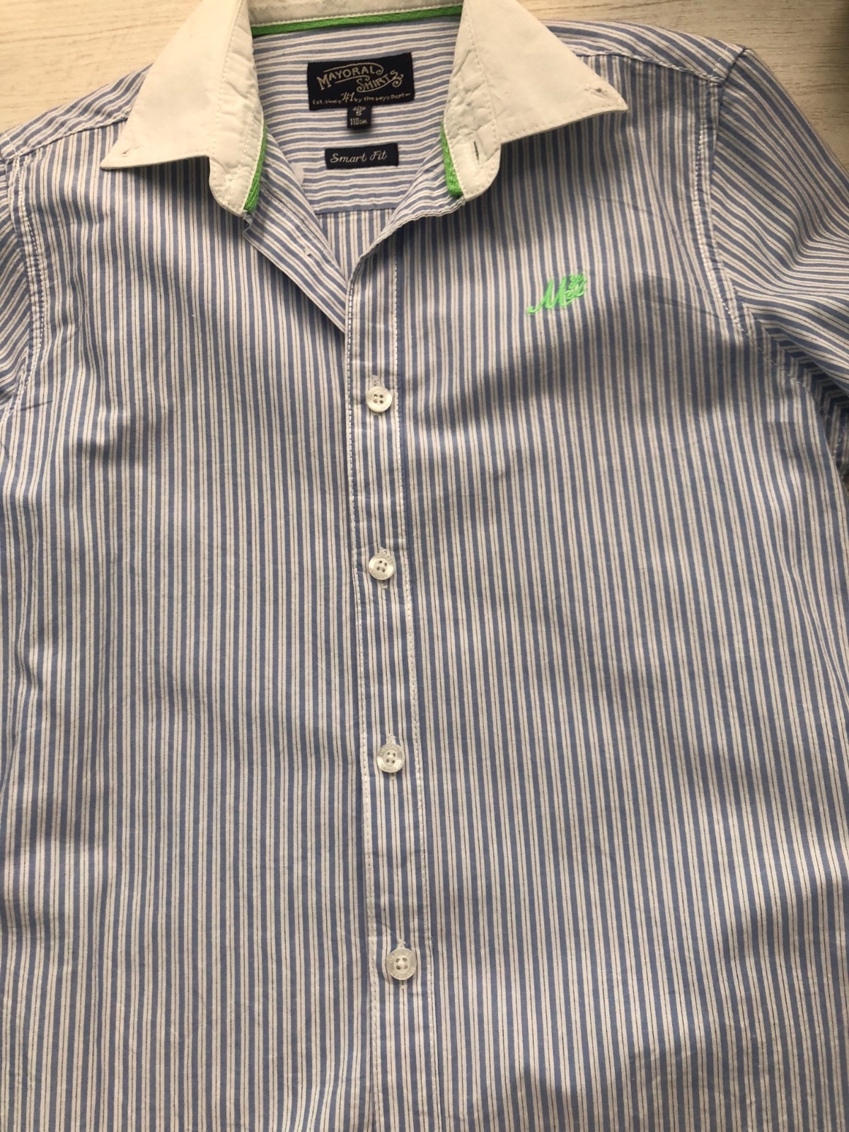 Predám krásnu košeľu značky Mayoral vo výbornom nepoškodenom stave. Veľmi málo nosená!!! Veľkosť 110. Dĺžka košele je 48 cm, šírka košele meraná pod pazuchou je 70 cm, 72 cm, dĺžka rukávov od pliec je 40 cm.