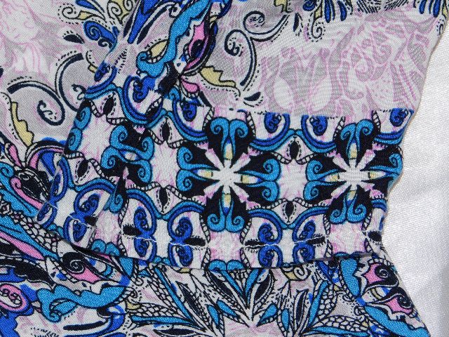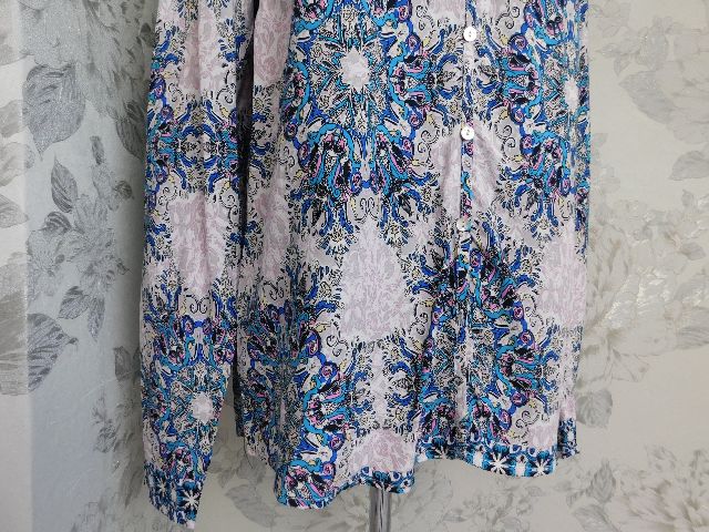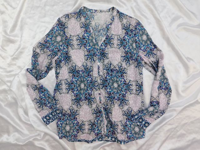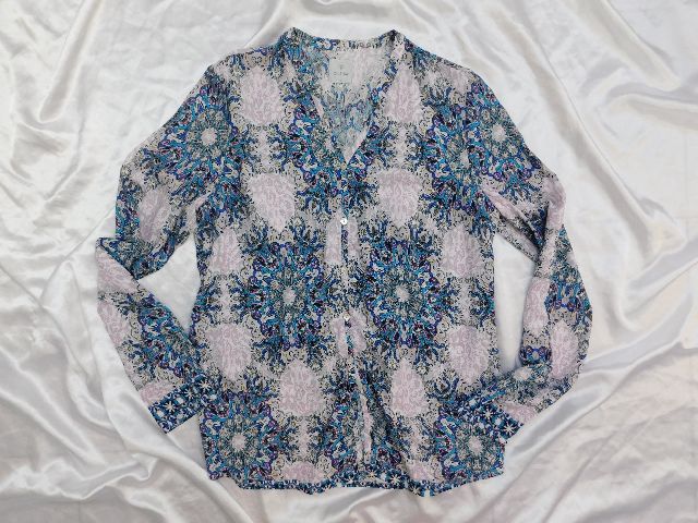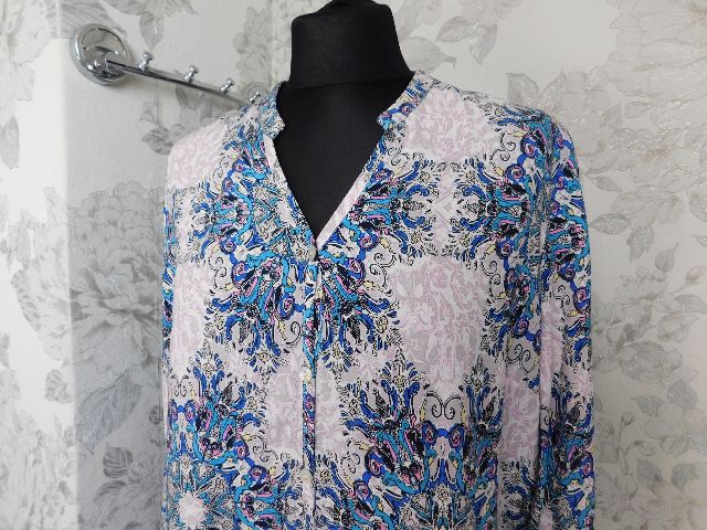 Kvalitna velmi pekna bluzka,s potlačou,vpredu gombikova lega,maly stojačik.100%viskoza.PC 69€.ako nova. se15