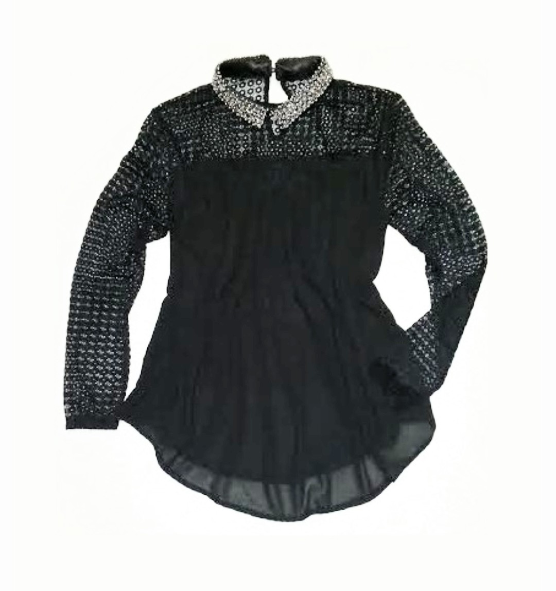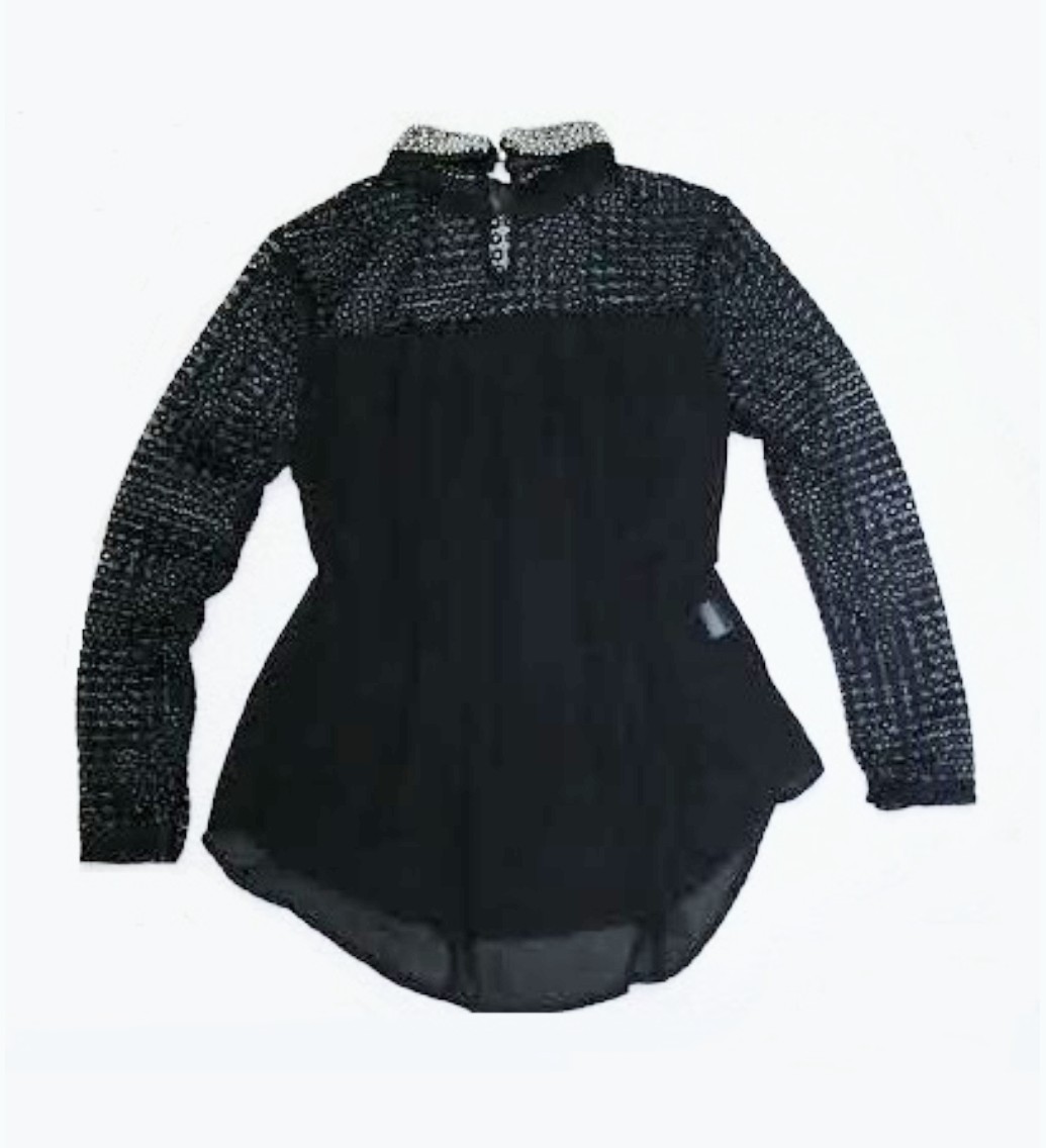 Nádherná šifónová blúzka kombinovaná s krajkou v čiernej farbe v retro štýle, ako na úvodnej fotke. Golier je štýlovo zdobený a to jej dodáva šmrnc. Dá sa nosiť na viac spôsobov. Kúpená pre dcérku na Vianoce cez internet, no žiaľ jej nesadla veľkosť, tak posúvam - len vyskúšaná.
