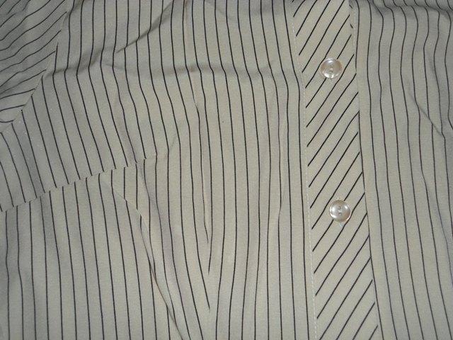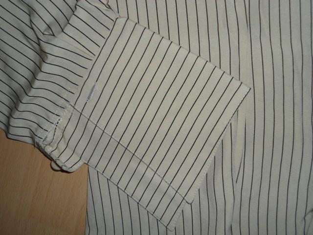 Blúzka z jemnej priesvitnej bavlny s tenučkými zlatými prúžkami. Pohodlne sa oblieka vďaka skrytému zipsu v páse naboku. Len opraná. Rukáv 46 cm, obvod 92 cm, pás 78 cm, celková dĺžka 60 cm.