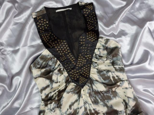 Kvalitná dámska tunika hnedých farieb, zdobený výstrih, nariasená, na boku zips, materiál