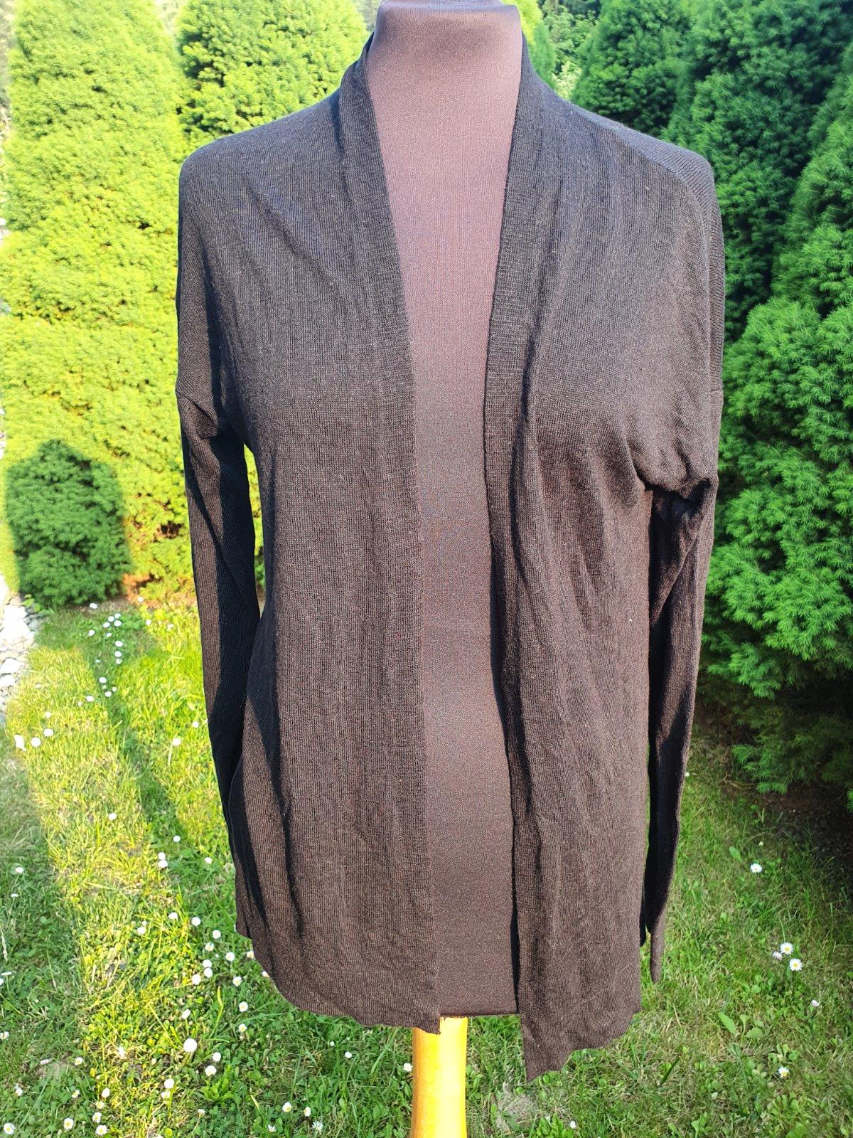 Strapcovy kardigan minimum noseny ziadne poskodenia. Velkost S, znacka AMISU.Rukav od krku 73 cm, od ramena 61 cm. Dlzka prednaj casti najdlhsej 89cm potom uz je dlzka tak 71 cm cize iba predna ca...