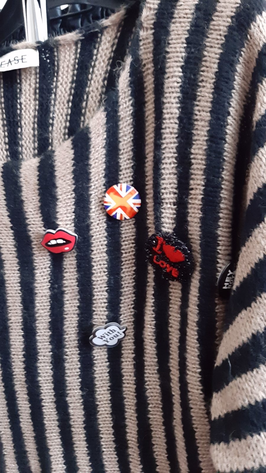 Svetrik je pretkavany zlatou nitkou, v dobrom nosenom stave, bez poskodenia. Zapinanie na maly kovovy hacik