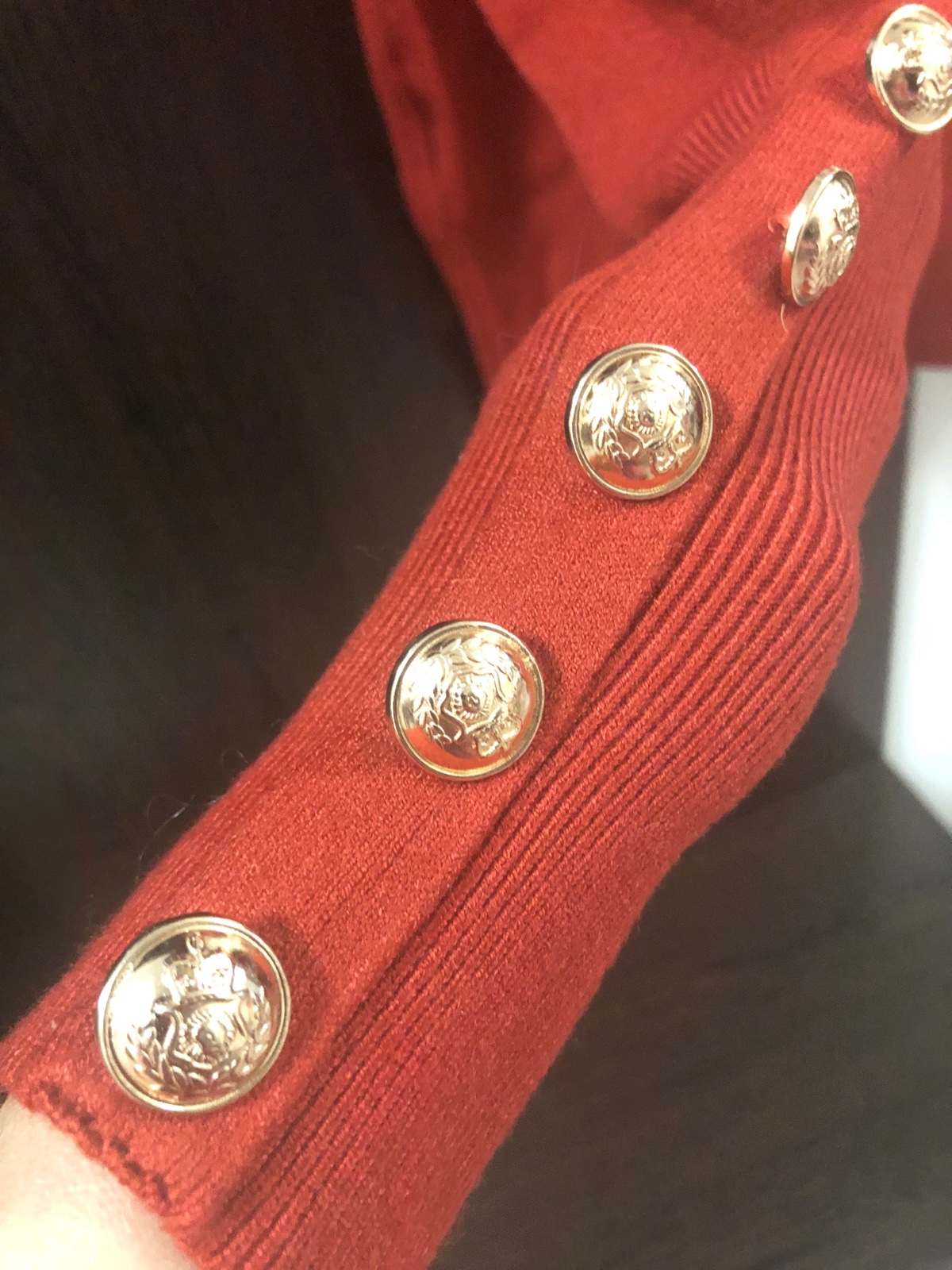 So zlatými gombíkmi. Farba je sýto tehlova, ako na úvodnej fotke. nie cervena!