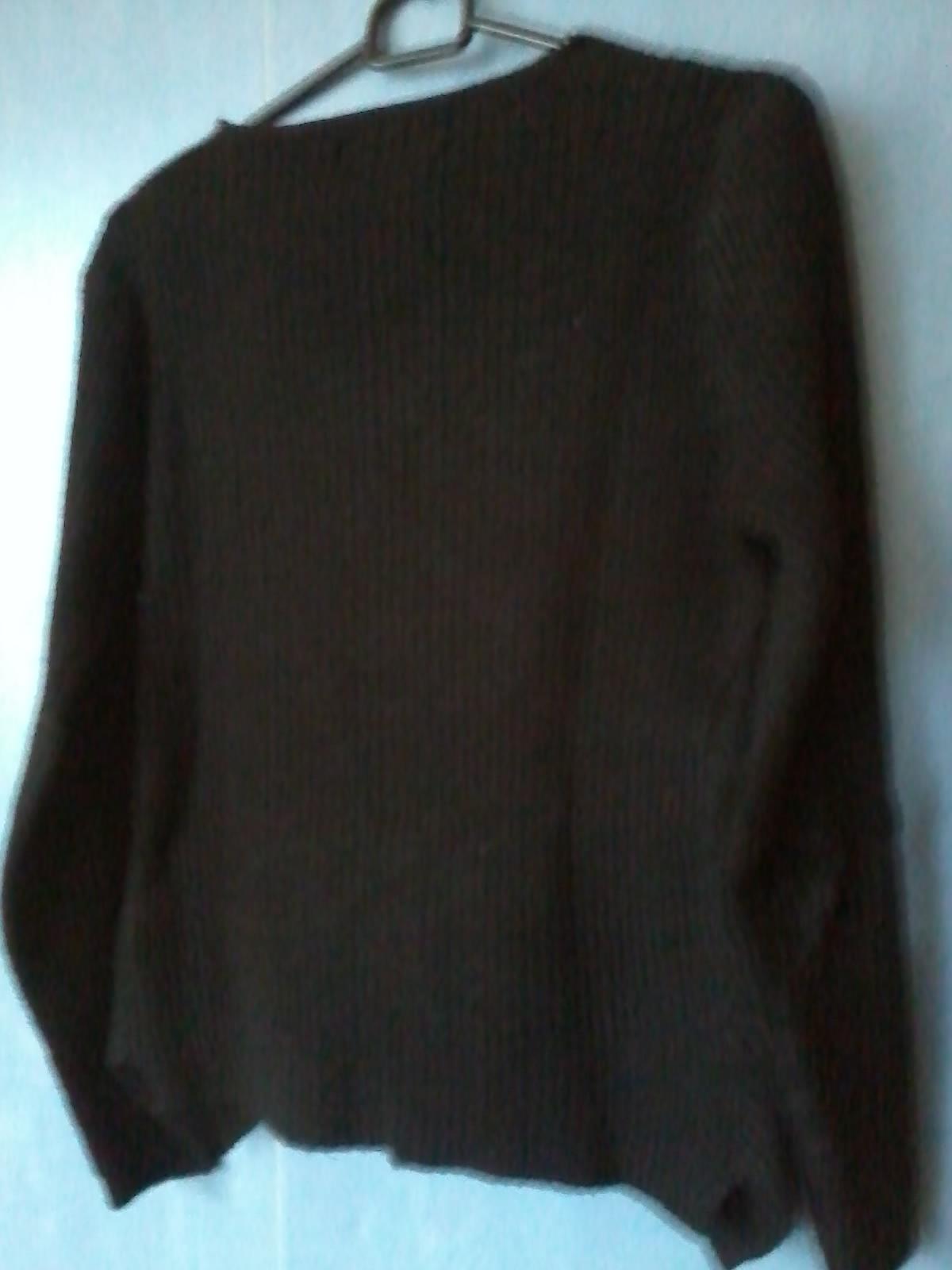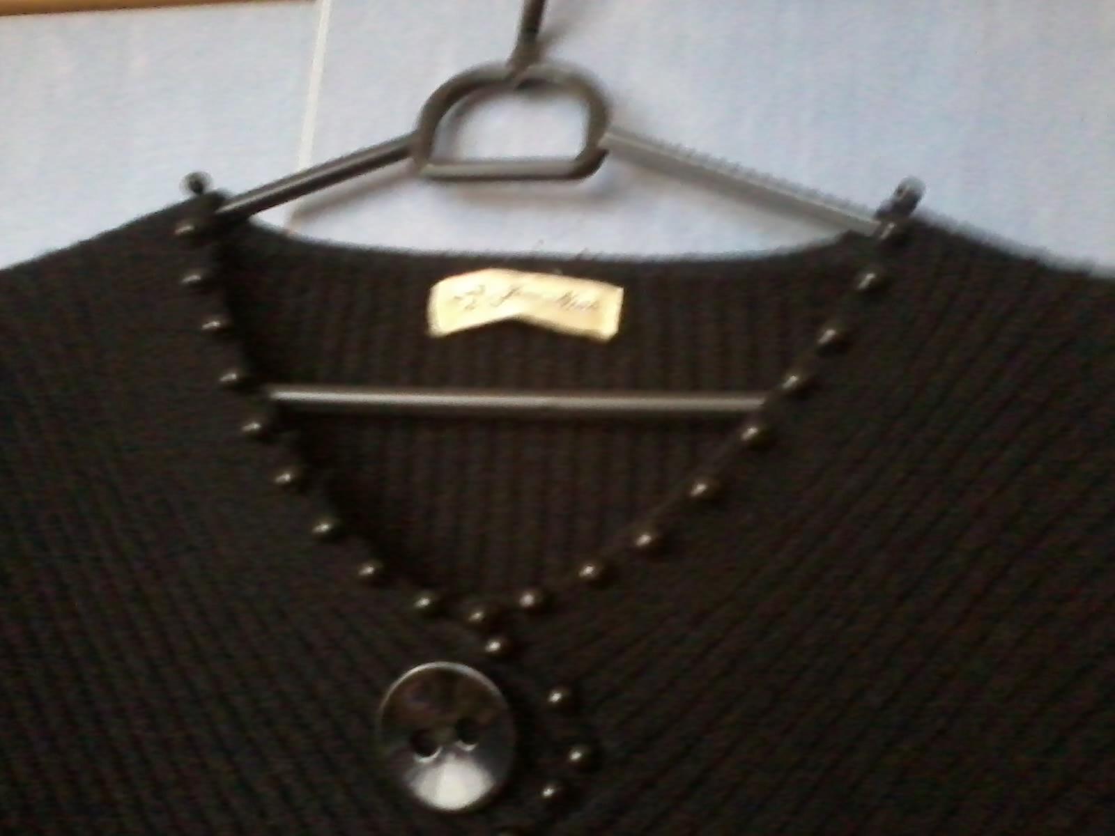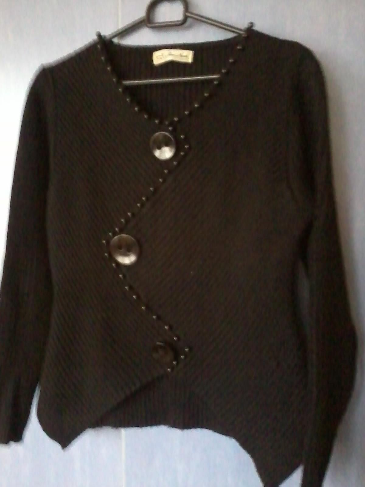 Predám nosený čierny svetrík s dekoráciou z gombíkov. Materiál je 65% bavlna a 35% polyester. Rozmery sú: plecia - 39cm, rukáv - 57cm, dĺžka - 56cm.