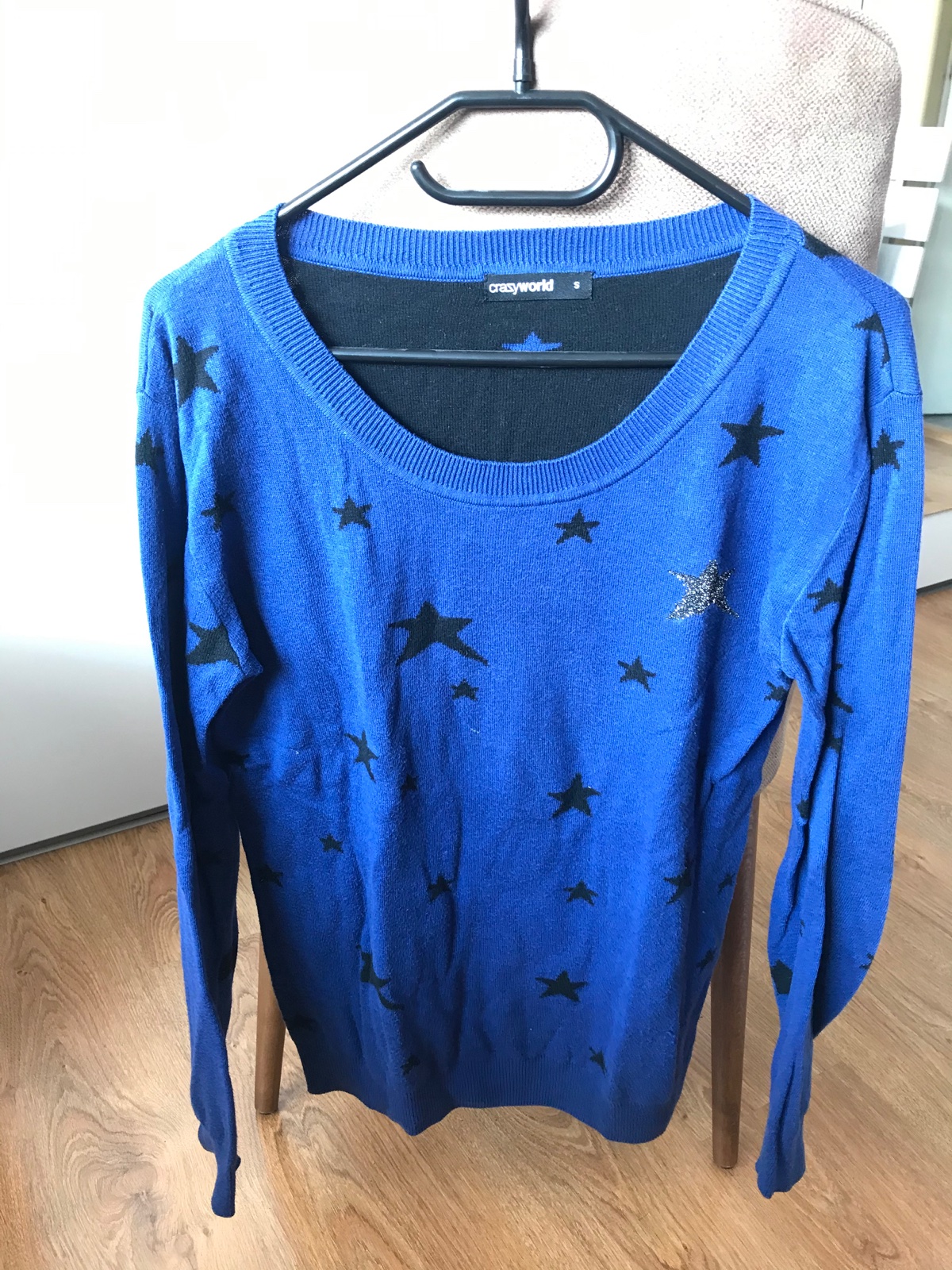 Veľmi pekný vzor, ručná práca. Vkusný odtieň modrej, je to taka tmavá oceľová farba. Velkost sedí na S alebo menšie M, rada premeriam.