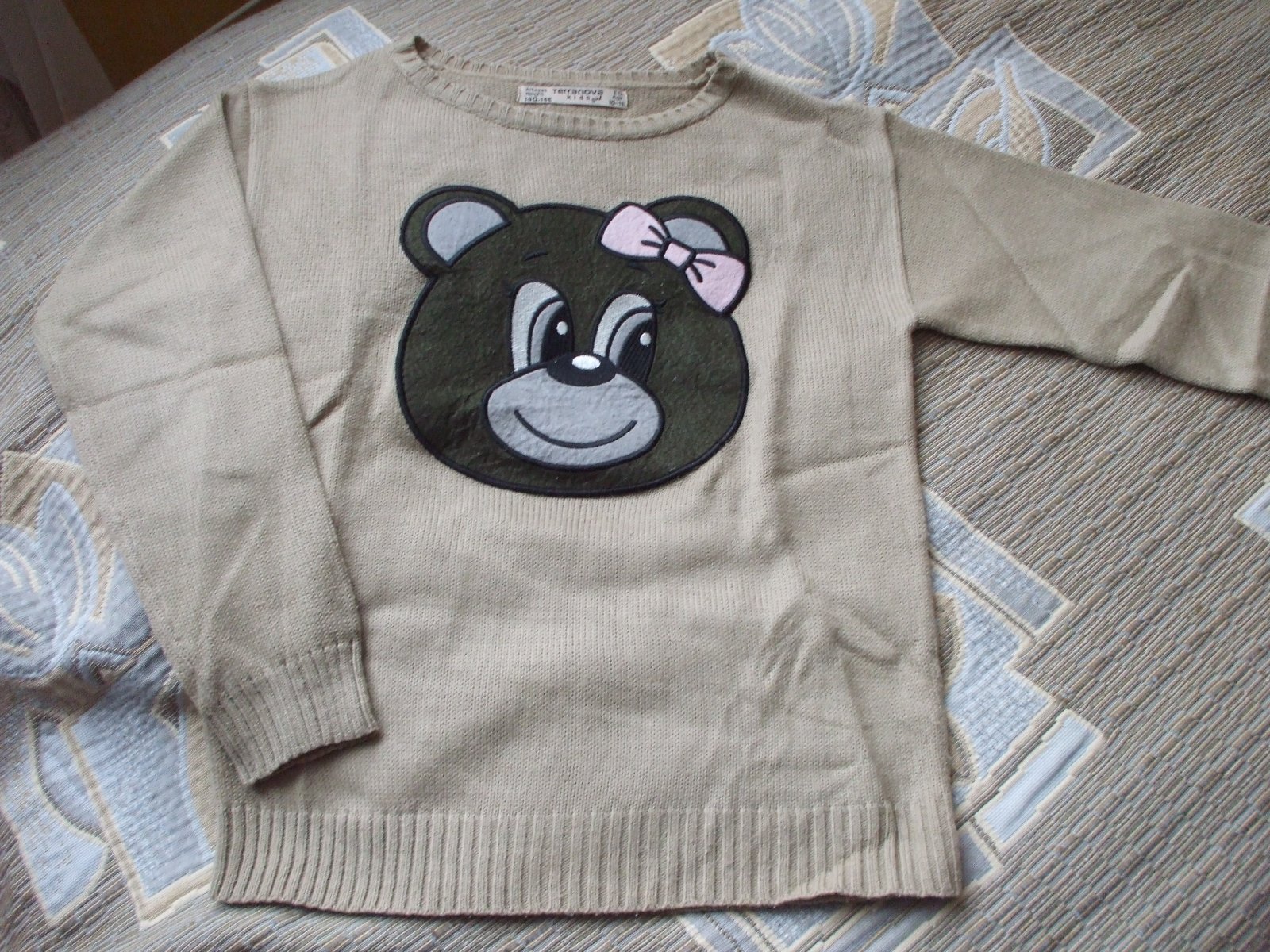 predám veľmi pekný pulover zn.Terranova v.140/146 - kupovaný nový nosený len dcérkou. vhodný k sukni i k legínam, pružný, mäkkučký, teplý materiál príjemný na nosenie, krásna lesklé aplikácia Macko...