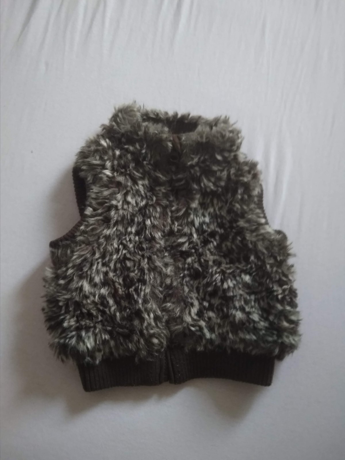 Krasna vesticka z umelej kozusinky vo vybornom stave. Je taka sivo-hneda s nadychom do fialova. Nezapina sa. ROZMERY: celkova dlzka: 37cm, sirka pod pazuchami: 29cm