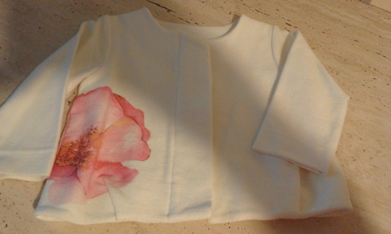 Nové nenosené krémové bolerko, zn. Zara, s maľovaným kvetom cez predný a zadný diel, vpredu na skryté zapínanie na gombíky. Vhodné na bežné nosenie i na slávnostné príležitosti.