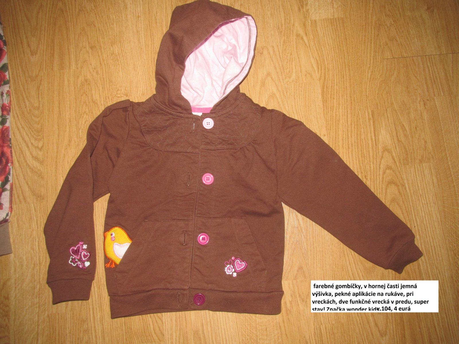 Predám hnedú mikinu, je na farebné gombíčky, v hornej časti jemná výšivka, pekné aplikácie na rukáve, pri vreckách, dve funkčné vrecká v predu, super stav! Značka wonder kids.